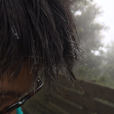 After we’d been resting for a couple of minutes the moisture in the fog began to form beads on our hair.