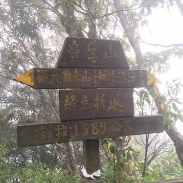 he sign at the top gives some information, the first one is just the name of the mountain, (Lubi mountain). The one with yellow arrows tell you what you can see to either side, to the left is Da Ba Jian mountain/Mount Sylvania and to the right is a view of the Hsinchu coast – we couldn’t see anything though. Under that there’s another sign warning you that you’ve reached the end of the trail and need to return the way you came. The bottom one says that you’re currently standing at 1589m above sea level.