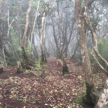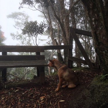 The trail is not well-trodden but it’s clear to see the whole way up, in a few patches we had to push aside ferns and spider webs to make our way up. The mist made it beautifully atmospheric and I spent most of the walk admiring the beautiful softness and subtlety of nature’s colours – lush, water-polished greens, the smudged, misty outlines of distant tree shapes, more browns than I could name, my favourite of which was the rich, rusty colour of the dog’s fur which looked just perfect amongst all the green and mist.