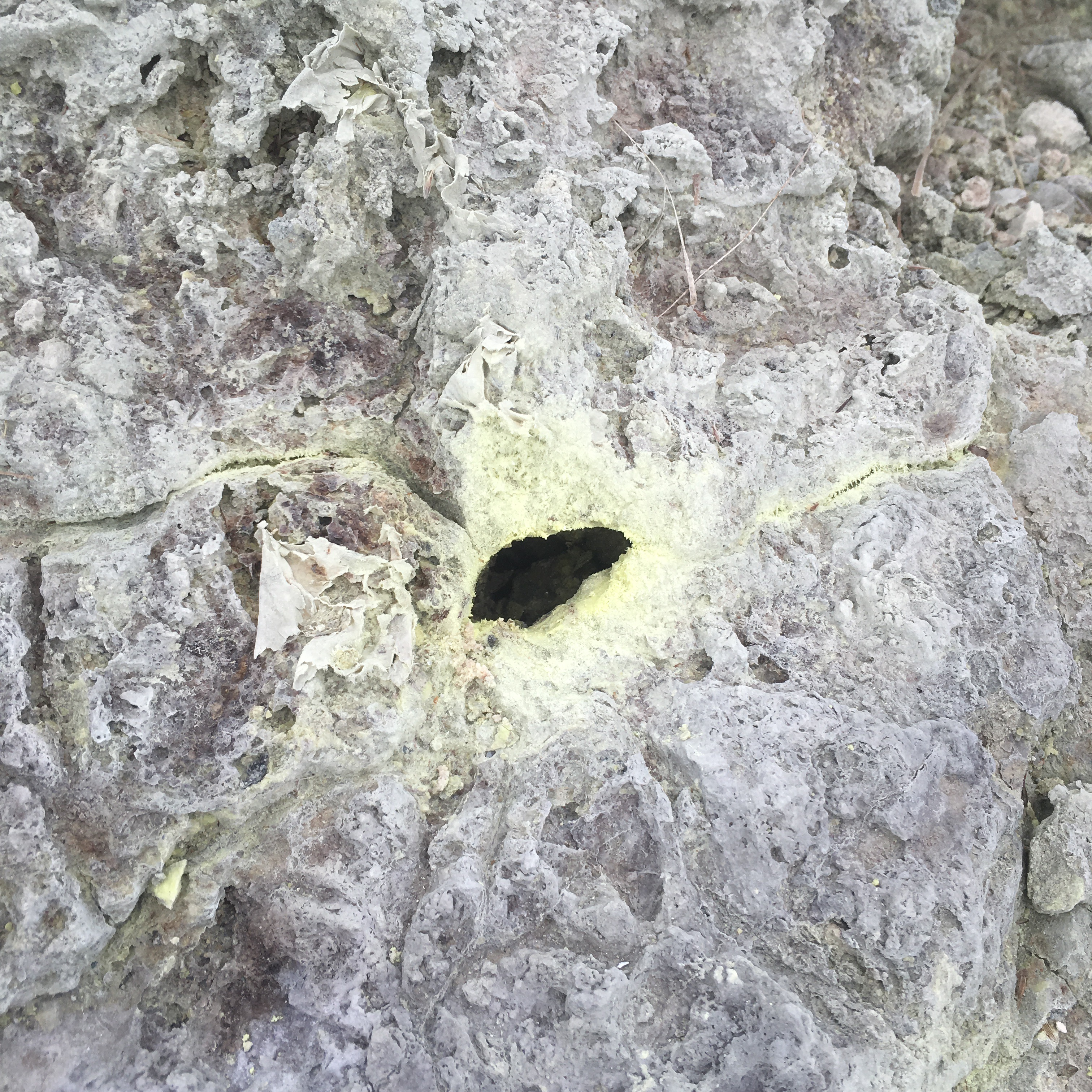 One of the small fumeroles – the yellowing around the edge of the hole is a deposit of sulphur-rich minerals which is left as a residue as the gases escape.