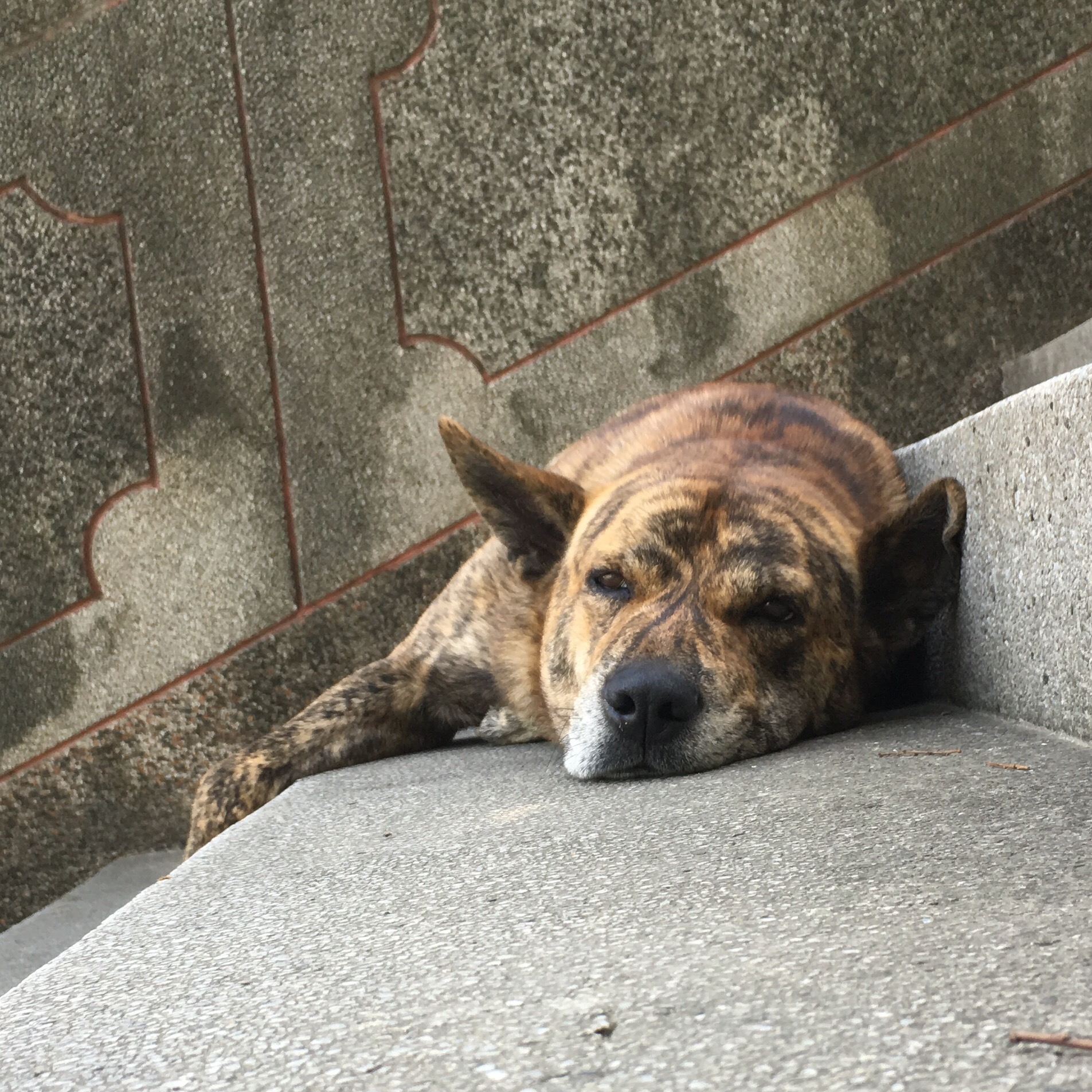 The steps were being guarded by a fierce tiger-dog but luckily it was his break time.