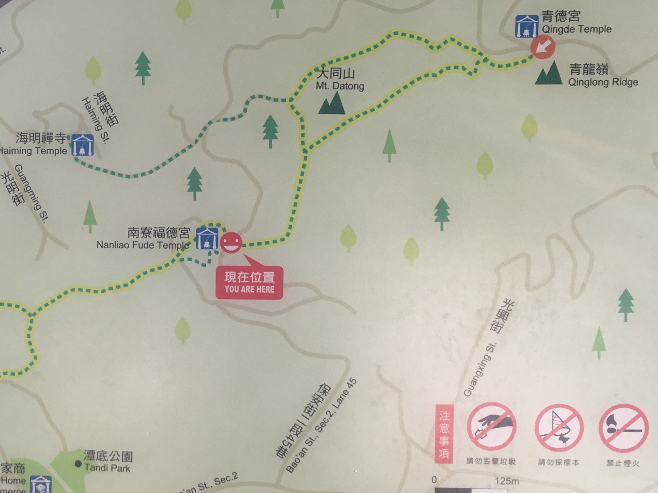 This map wasn’t quite at the start of the trail but it’s pretty accurate. We went from Nanliao Fude Temple up to Qingde Temple. Via the path which goes round to the left of Mount Datong and then back down the road.