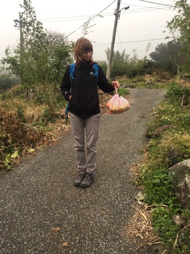 Once at the top we saw white. Lots and lots of white – I’m sure the view is just grand but it was absent when we went. Instead of looking at great scenery we enjoyed watching some of the tough guys of tough guy hill – this abei was all lean, ropey muscle and was evidently oblivious to the cool air, (the woman in the picture was checking the temperature – it was 15 degrees). If we had started hiking earlier I would have liked to continue hiking a bit further or try to find another way down but as it was already 4pm it seemed more sensible to head down the same way.