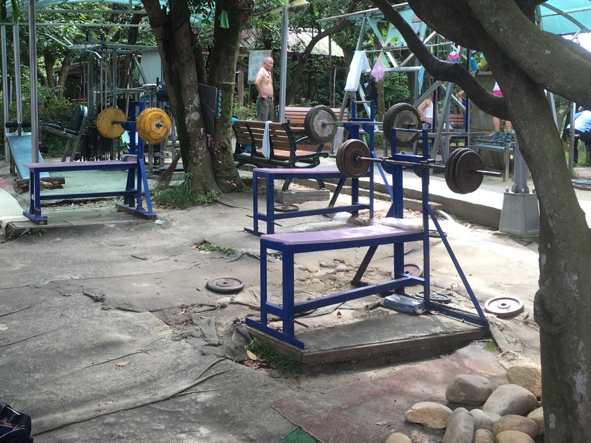 *Note the upside-down man in the above picture – he was at least in his sixties (probably older), and exercising in a button-up shirt and long trousers with a belt – he looked like he was dressed for the office! Just prior to doing hanging sit-ups he had been doing weighted pull-ups with a plate weight gripped between his knees. I seriously hope that I am lucky enough to have such rude physical health at that age.