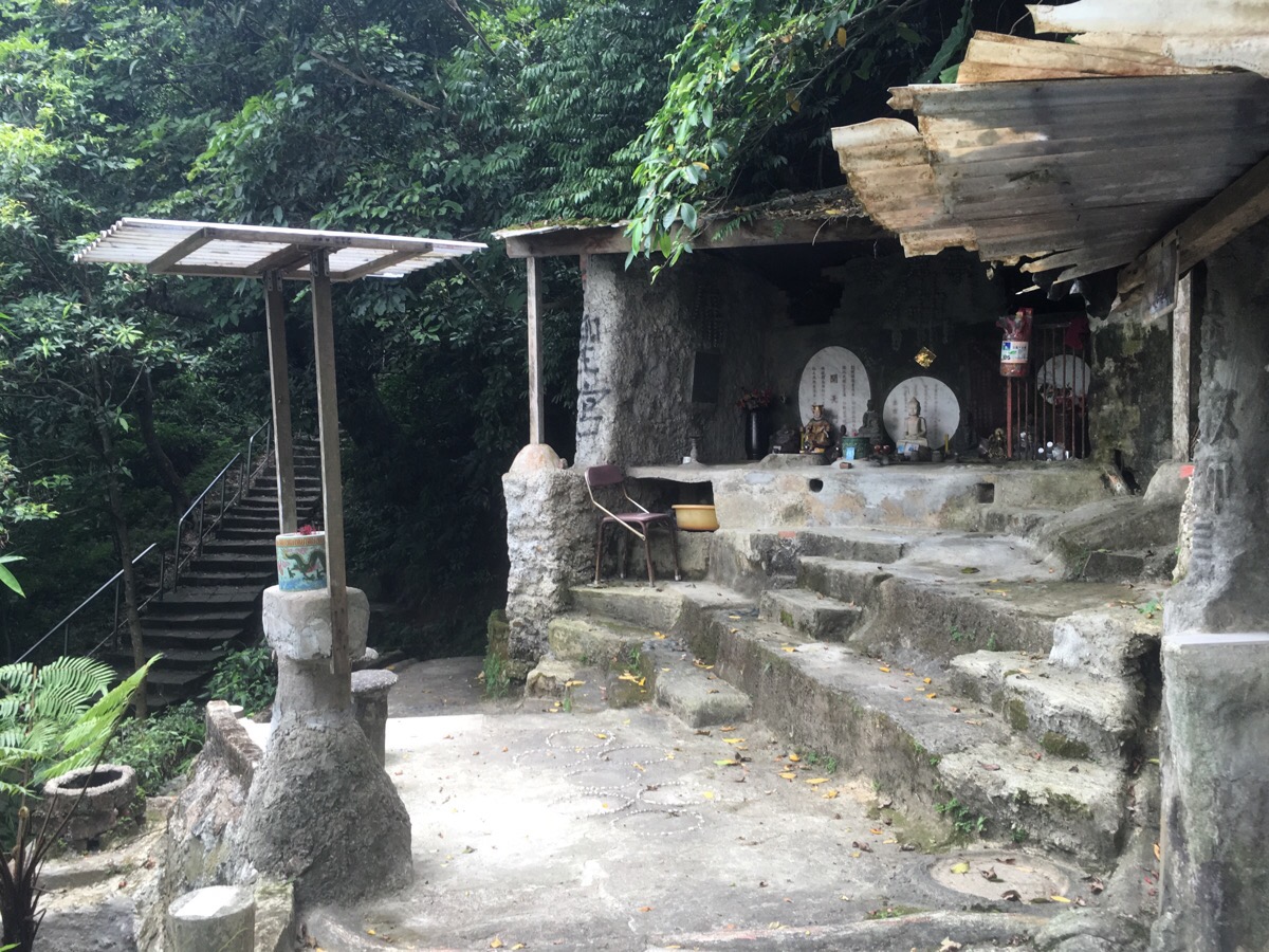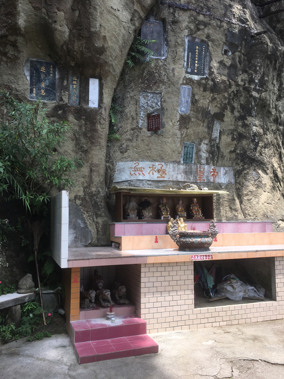 There was another shrine, this one built into the wall of a cliff. Looking up it seemed that there might have been an awning at one point but not any more. The set up of this shrine was different to other shrines I’ve seen, maybe more like some I saw in Hong Kong. The five deities were lined up against the wall and a pack of guardian lions were placed in a smaller alcove below the main alter. To the left of the shrine there was also a plaque on the wall with an incense holder which seemed to be dedicated to a Chinese general. I asked Teresa what the plaques on the main wall were – she said they looked to be mostly names of the Gods who were worshipped there.