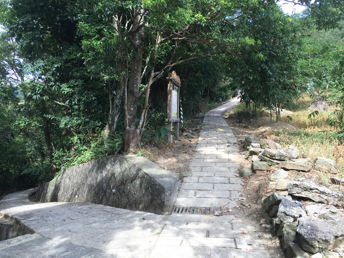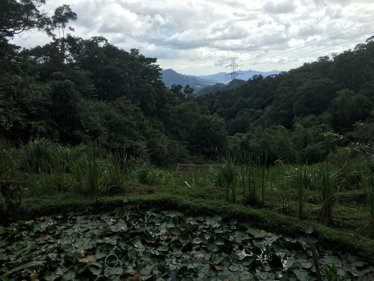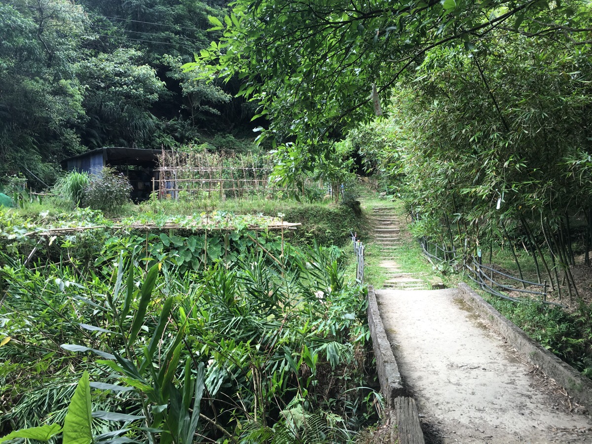 For this part of the walk the path curves around the side of a hill with the up on the right and the valley on the left. At the inside of the curve, there’s a very lived-in traditional farm building. When I passed it the radio was blaring out Taiwanese songs, there was a woman laying out slices of white radish to dry in the sun and a man cleaning out the drainage area of a small lotus pond.