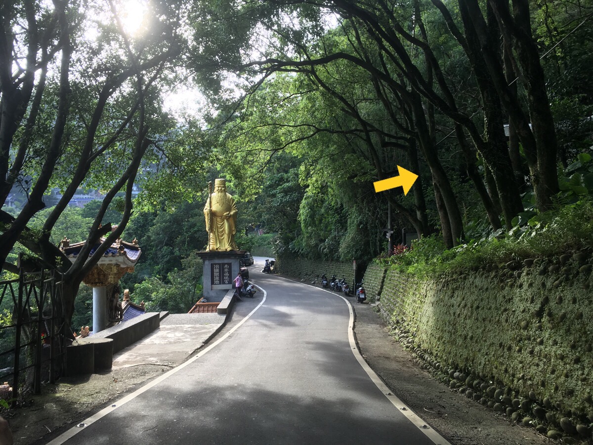 The gold statue marks the top entrance of Shulin Nan Liao Land God Temple, (the temple with the pool). The steps continue up on the opposite side of the road.