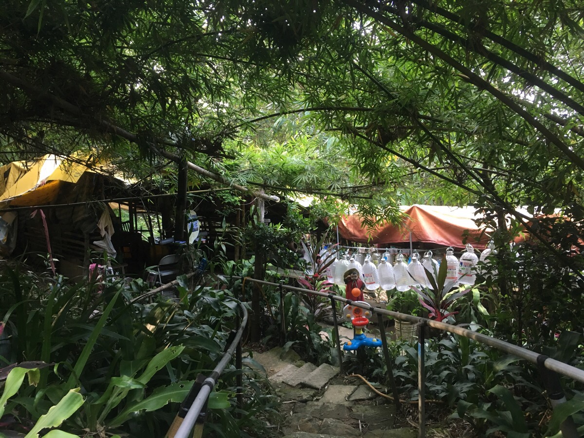 The steps continue up, passing a shelter/karaoke area with exercise equipment and a kind of vegetable garden.