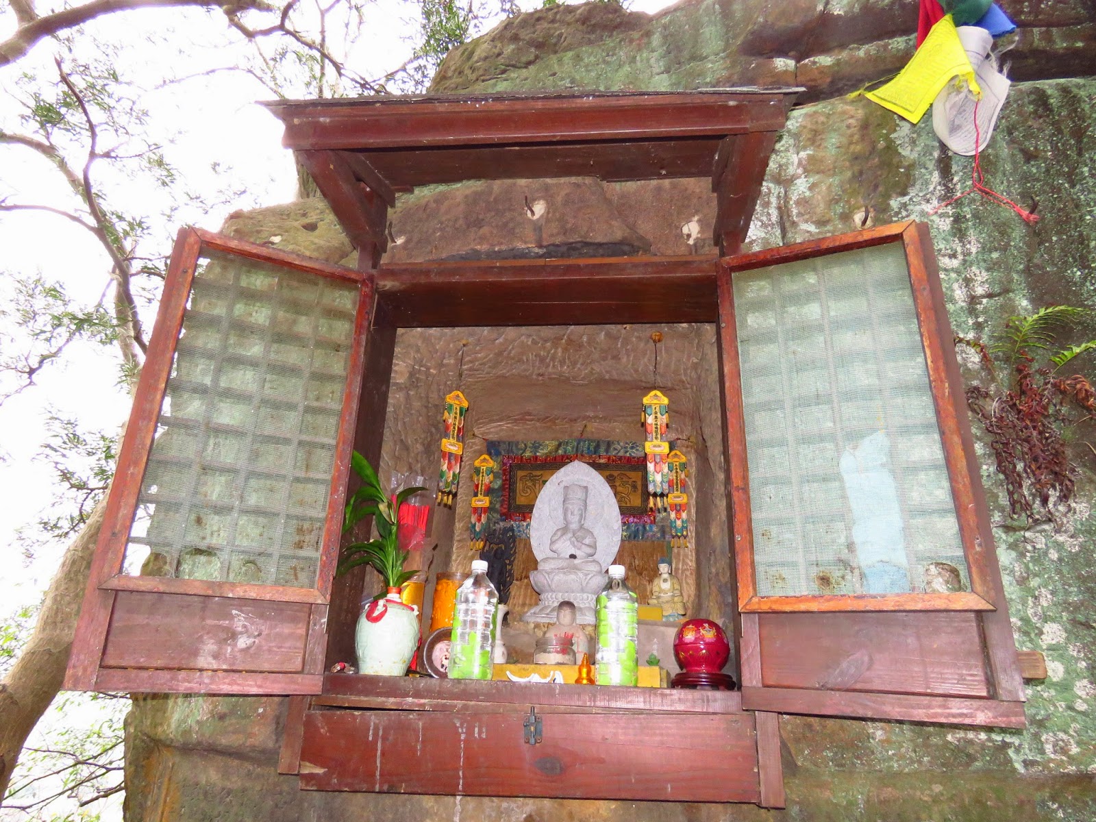 There are two little shuttered shrines, one carved into the front of the rock and the second round the back, a narrow gap between the rocks acts as a passageway between the two.
