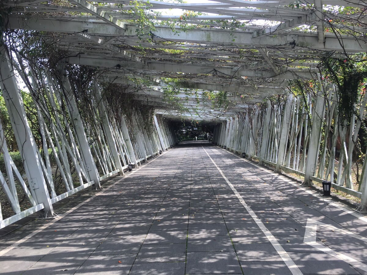 Riding east through the park, you arrive at the rather romantically named ‘Floral Tunnel’ – the structure is draped with Chinese Hibiscus, Siberian Elm and a variety of Bougainvillea and as informed by a nearby information board: “look up and you will see flower globes hanging like fruit from the branches of trees; look down and you will see swaying lights and shadows formed by the rays of the sun. The plants along the sides of the tunnel spread their leaves and blossoms as if welcoming visitors to a floral embrace.” (If only the writer of this beautifully poetic English had been consulted on the signs for the ‘Sonth’ Riverside Park that I saw later in my journey.