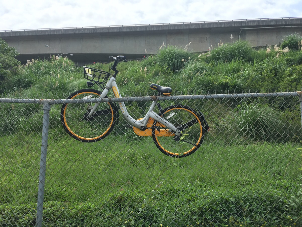 An oBike hanging out on the railings – these YouBike usurpers were lurking all over in nooks and crannies of the park.
