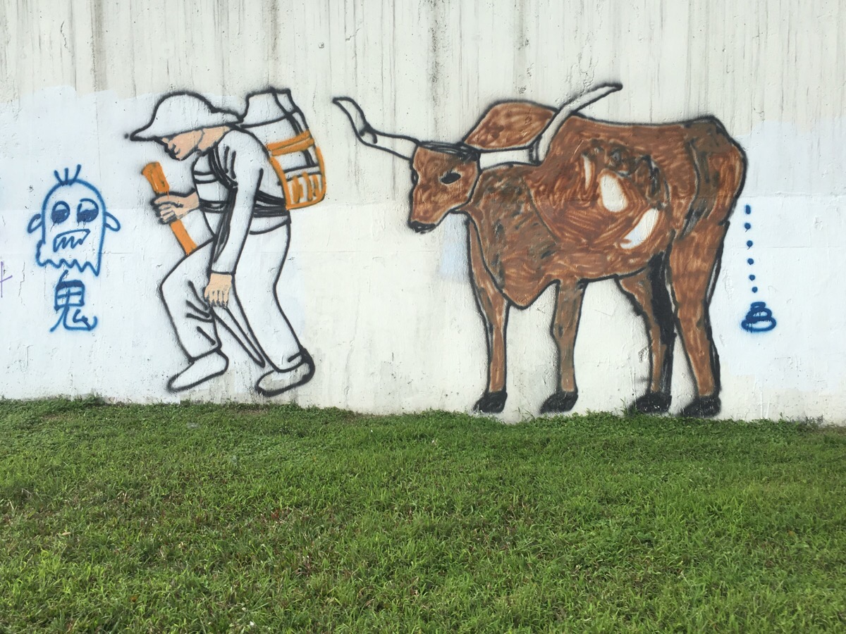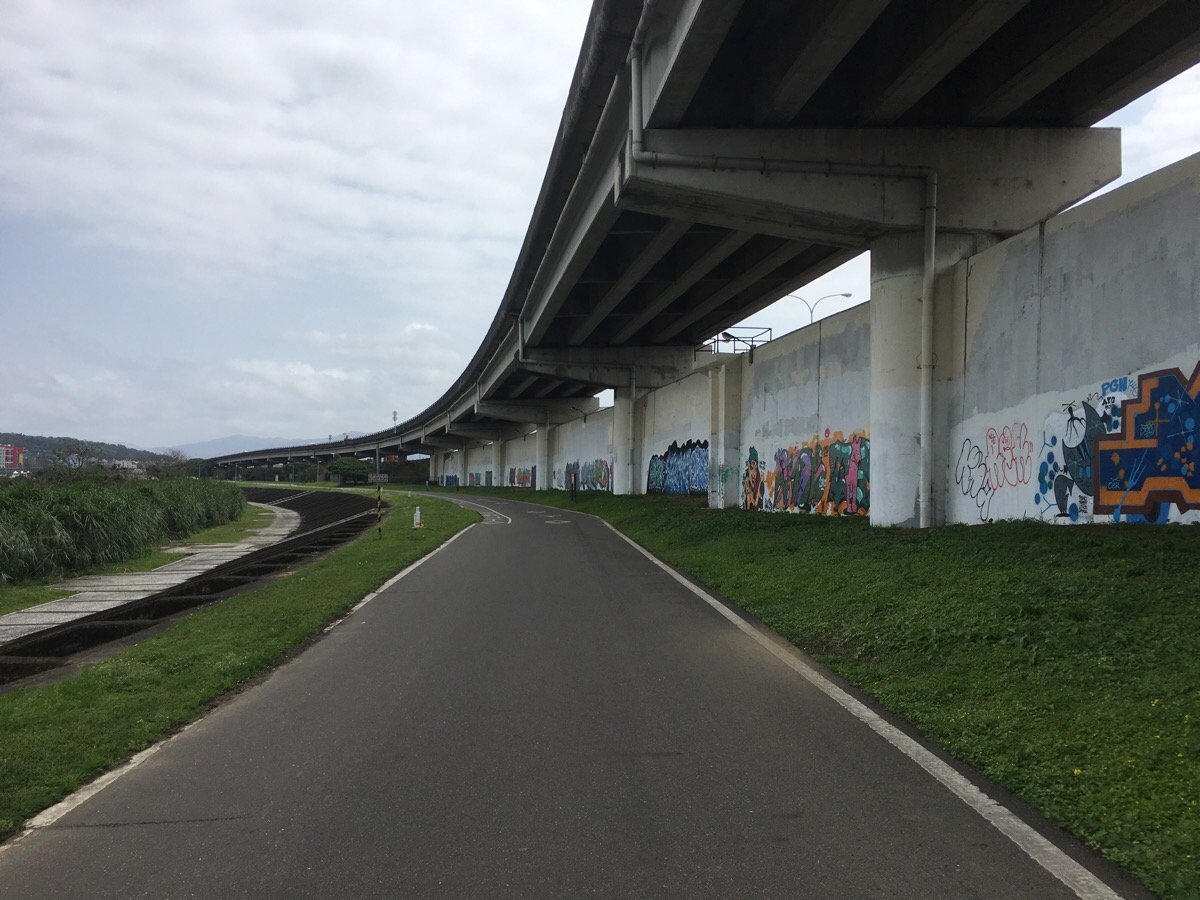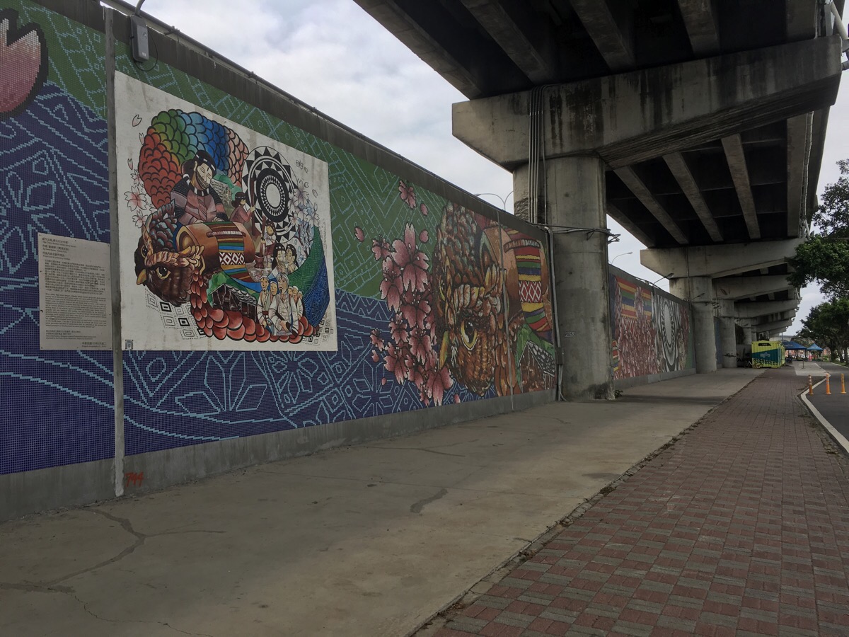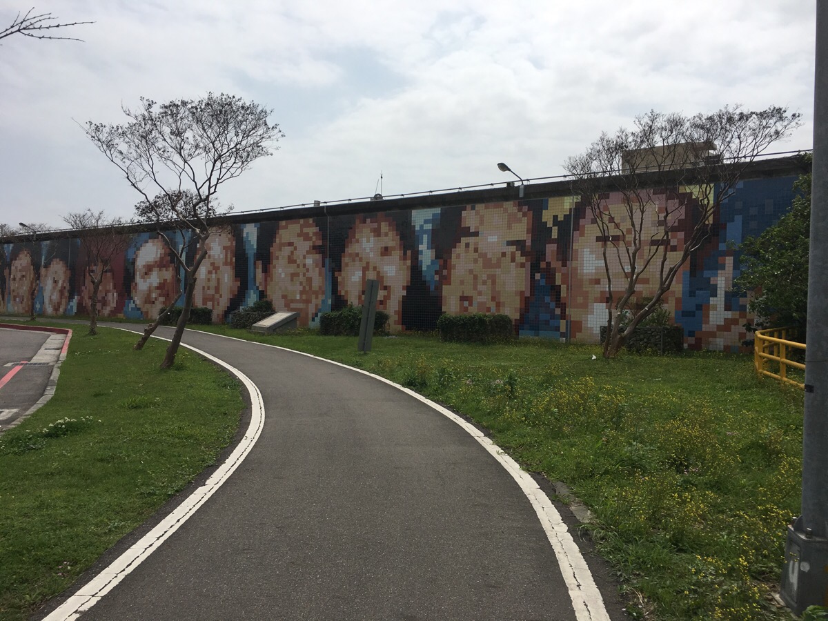 One of the things that I enjoy about cycling Taipei’s river cycle paths is that in many places, the imposing flood defense walls have been turned into large-scale canvasses. Sure, you’re more likely to get safe, crowd-pleasing art than anything thought-provoking or especially exciting, but it’s nicer to look at colourful walls than plain, stained concrete.