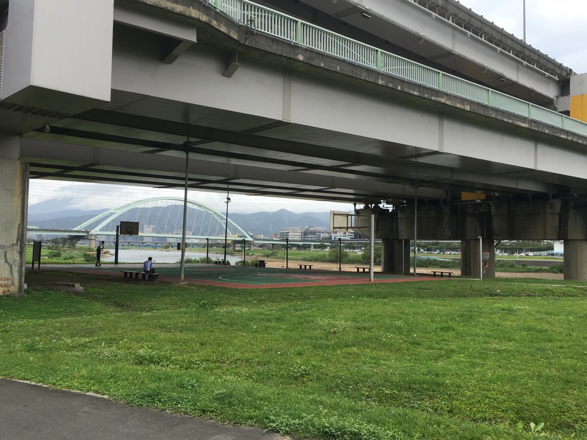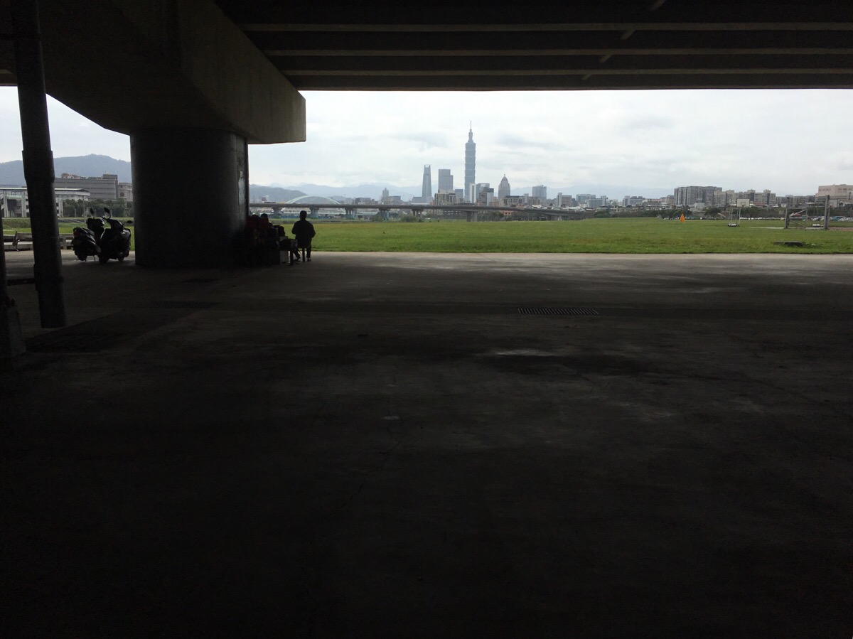 Cycling out of Yingfeng Park, the next park arrived at is Guanshan Riverside Park – this section boasts a variety of interesting bridges. Under the first bridge, you can get a framed view of Taipei 101 as well as a free concert from some saxophonists. I’m not a great fan of the saxophone, and the fact that they have relagated themselves to lurking under motorway bridges simply reinforces my predujices – they know where they belong. To make matters worse, there were three of them, sitting together, all playing different tunes. (Why? To concentrate the noise pollution?) There was at least one here the last time I came by too, it must be a regular saxophonist haunt.