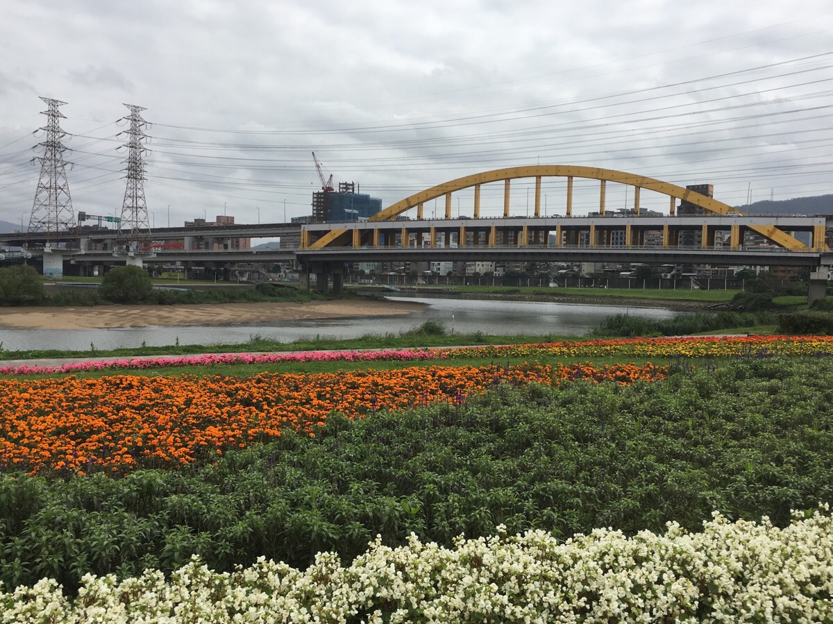 Where the cycle path approaches Maishuai bridge, a colourful display of flowers carpets the ground. Since this is Taiwan, the fact that a park has flowers has been deemed news-worthy for at least two consecutive years, and it’s because of this brave and tireless reporting on pressing topics that I know that the flowers species on display include petunias, salvia farinacea, peacock grass (me neither), white sage, ‘romantic purple flowers‘ wax bergonia and Mexican marigold. Let’s hope that Taipei’s Hydraulic Engineering Office continue to clothe the park in flowers for many springs to come.