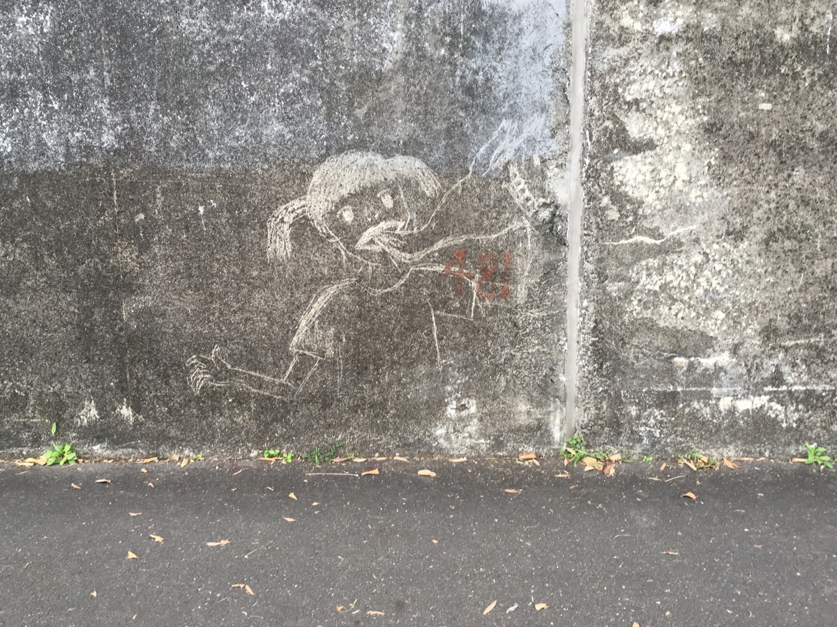 Instead of being painted on the walls, the pictures were scraped into the grime and algae that has covered the concrete. Some of them, like the unnerving one above had used already-present forms as inspiration.