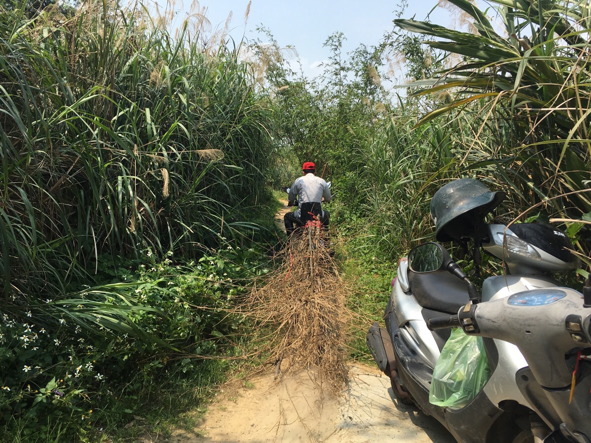 They all seemed to be hard at work, however, the award for greatest effort shown goes to this guy who had secured a bundle of 4-metre bamboo poles to the back of his scooter, which he then rode over the narrow and winding dirt track. The effect was that of a drab but speedy peacock.