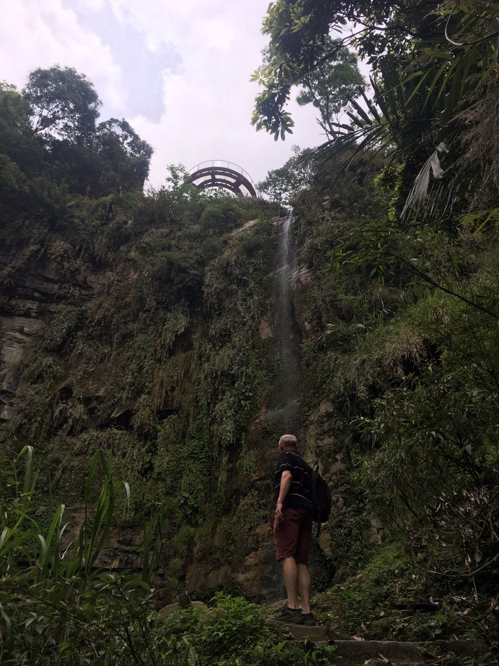 Just half an hour after leaving the car we made it to Long waterfall – actually the Chinese name is Dragon waterfall, but I’m not sure what’s so dragony about it. Besides the spectacular stream of water, the first thing we noticed was the giant glass walkway jutting out over the rock wall. This is Zhongliao Skywalk – a small U-shaped construction that you can walk over for $100.