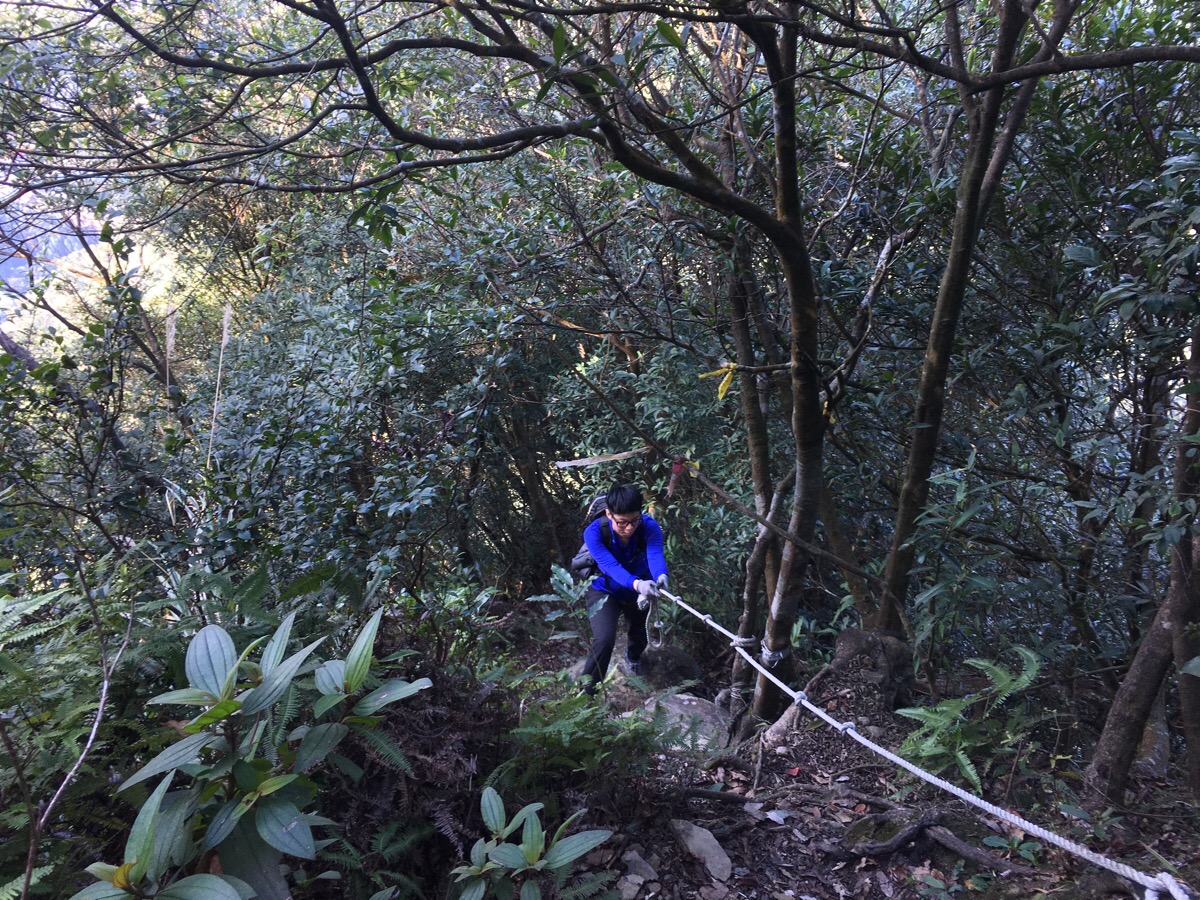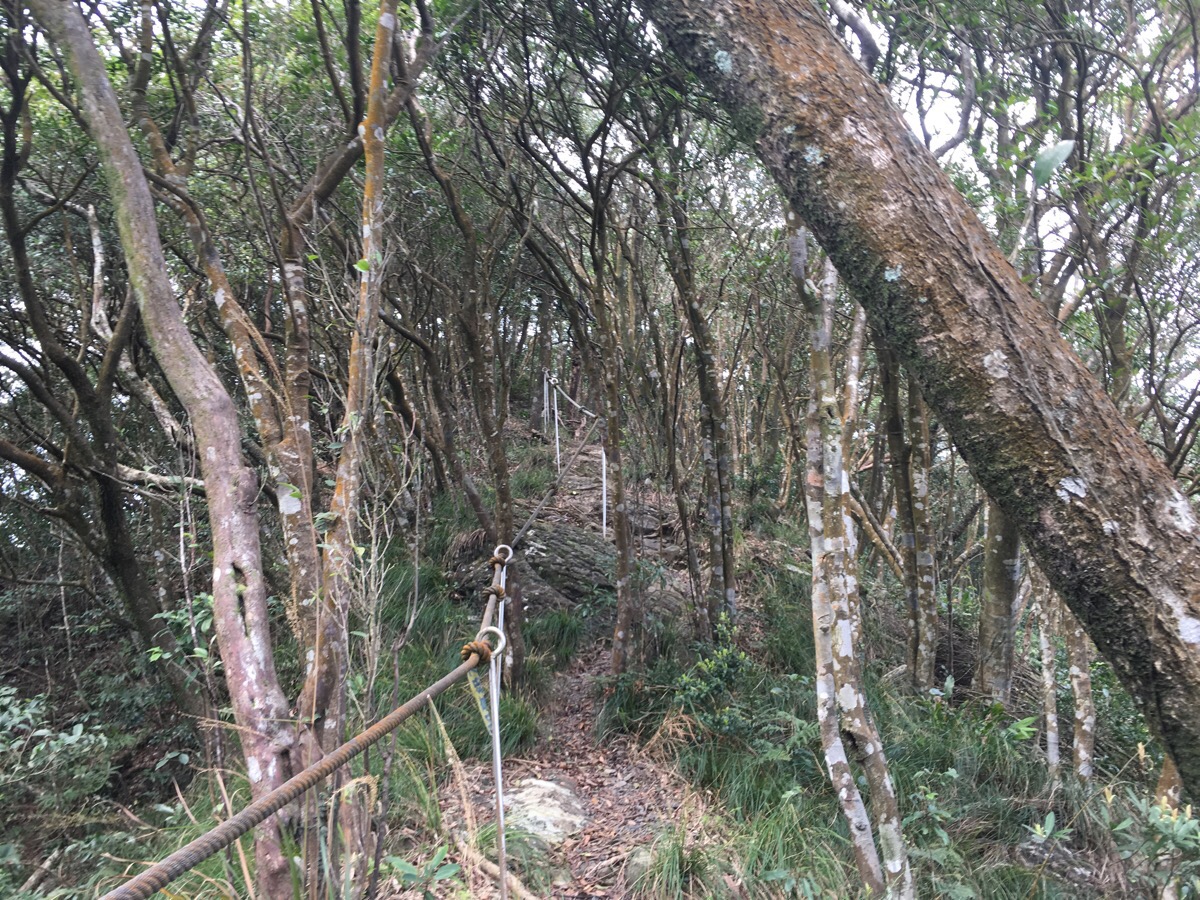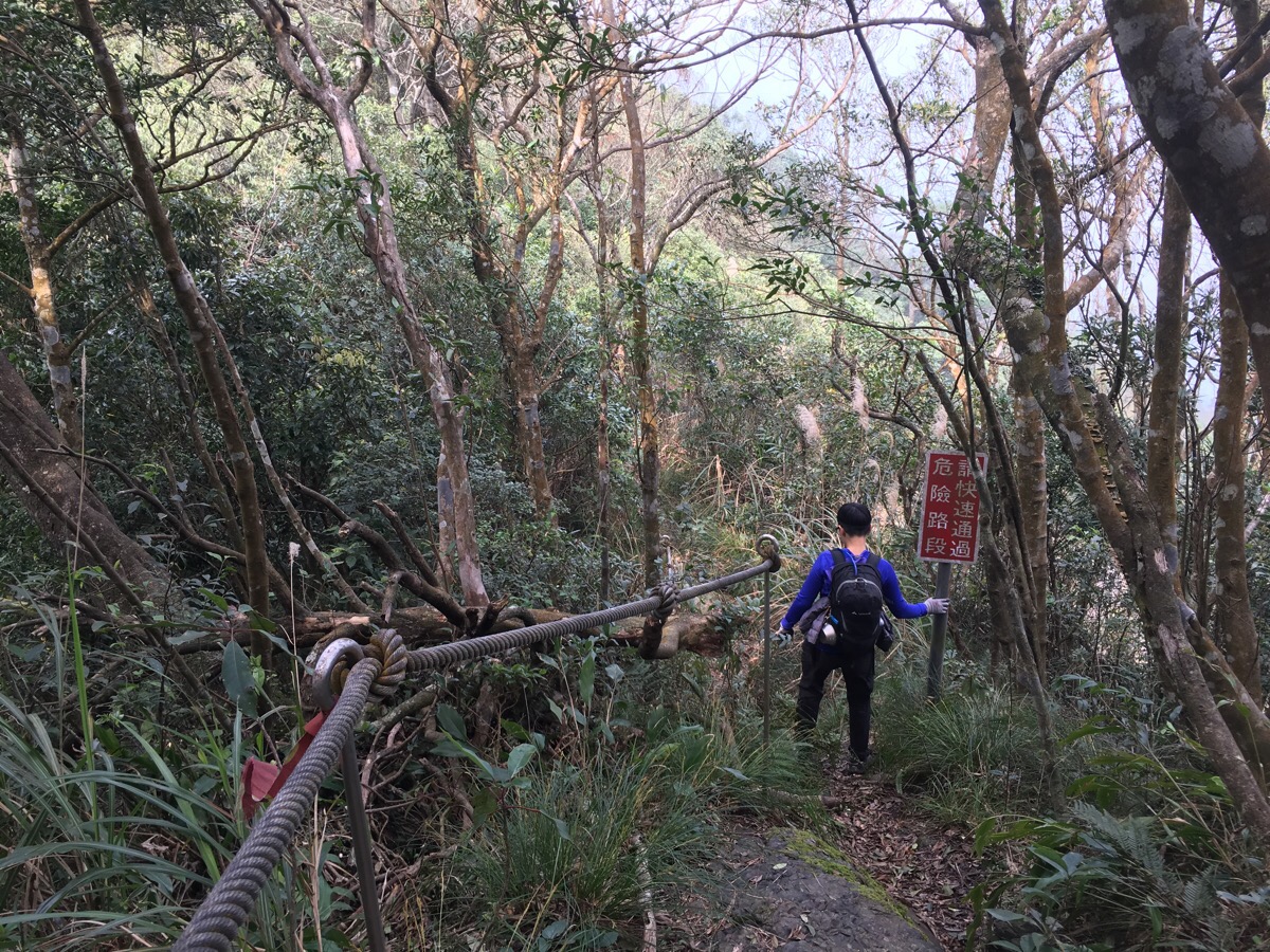 Difficulty (new Taiwan hiker): 7.5/10 – It’s challenging, don’t get me wrong, but either I’ve toughened up a bit or it’s not as difficult as some others we’ve attempted. It’s steep, there are numerous tricky roped sections where you really wouldn’t want to make a mistake, and the upwards path surface is mostly loose shale. For these reasons, it wouldn’t be smart to do the loop in reverse, (roped sections and loose surfaces being twice a as bad heading down). Having said that, this trail doesn’t require as much upper body strength as some trails we’ve done, there aren’t so many alarmingly exposed sections (although there are one or two spots where the path traverses a narrow ridge with only trees to half hide the dizzying height that you’re at), and as long as you have a basic idea of where you’re going (preferably with a map), it’s very easy to keep on the correct path. For experienced Taiwan hikers this would be pretty fun, for inexperienced hikers or those new to Taiwan’s trails it would be extremely hard.