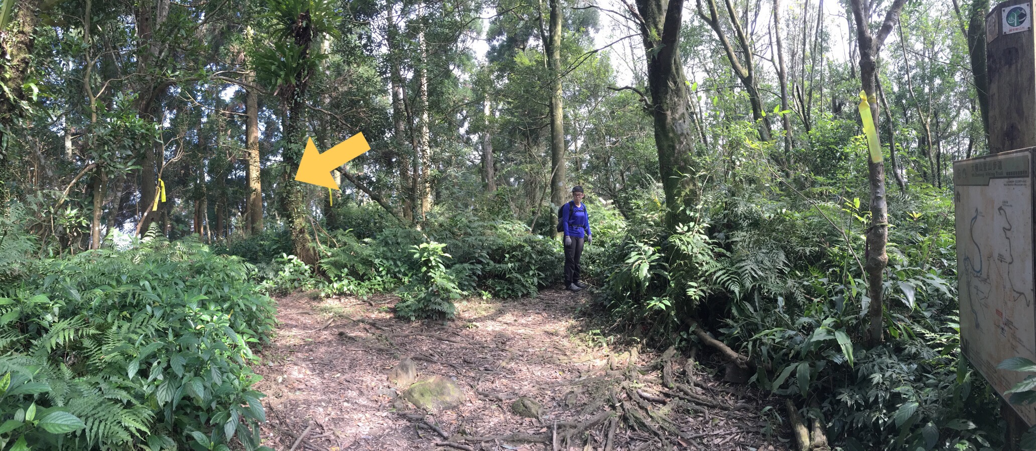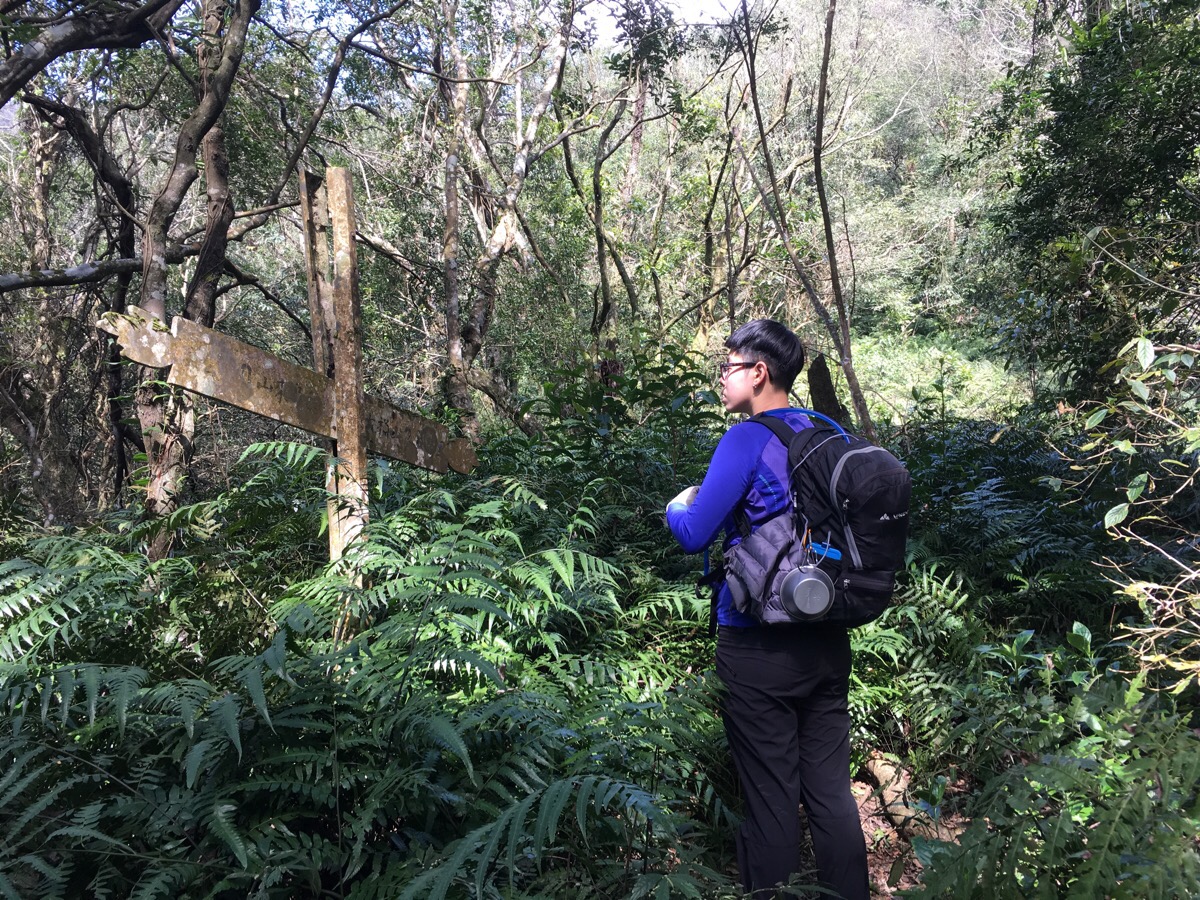 14:21 – After a 40 minute lunch break, we carried on our way down – this is the junction with the trail which heads to 四崁水山, the lefthand trail down to the road is the only clearly visible trail so it should be easy to stay on track.