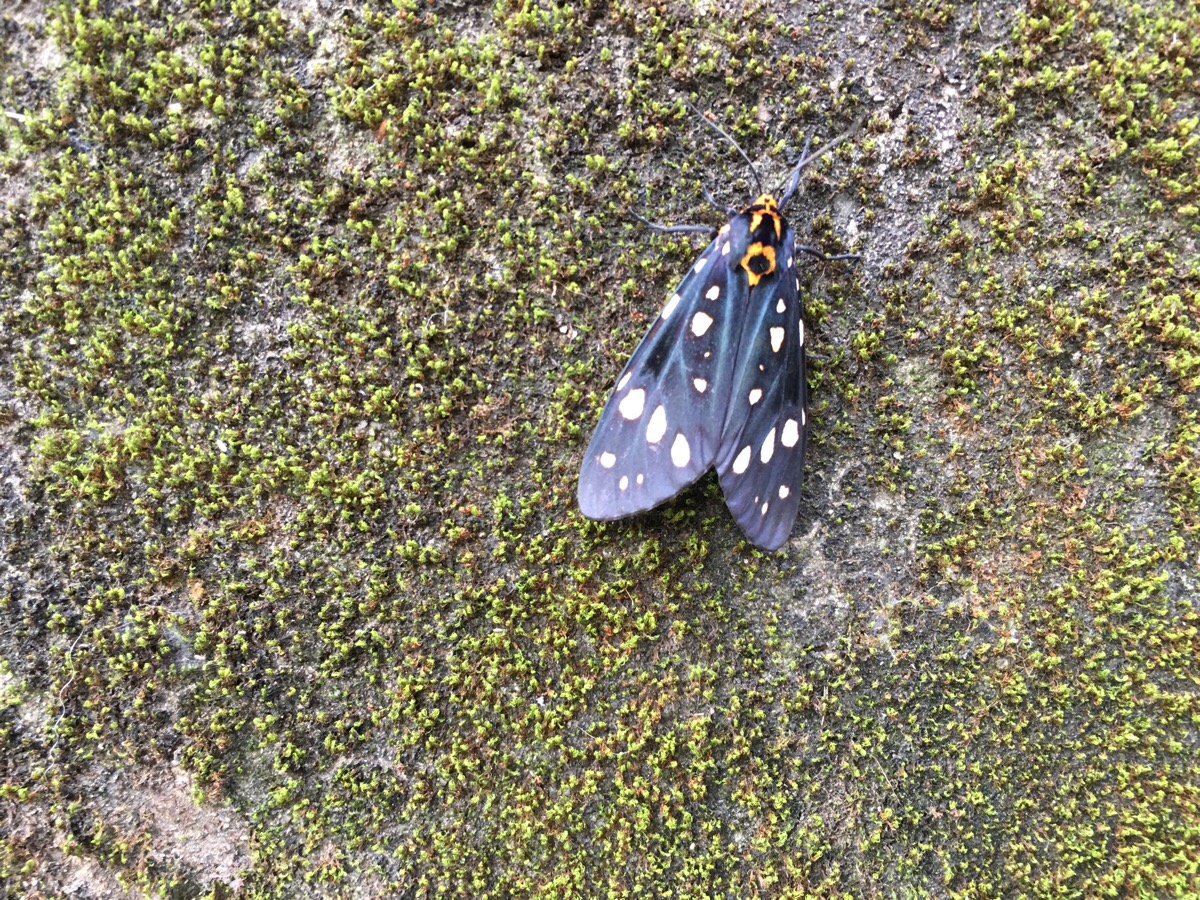As the road descended into a small village we passed a taxi driver who seemed to be doing double duty as a beer delivery man by loading up large numbers of heavy crates then carrying them from his taxi into a building whilst noisy dog yapped excitedly around his legs. It was at this moment that we spotted this brightly coloured (when it opens up there’s a lot more yellow) moth fluttering around on the road as if it was just getting to grips with its wings. Later identification efforts using the wonderful tool that is Project Noah have informed me that this is a Histrio Tiger Moth (or Alglaomorpha histrio formosana).