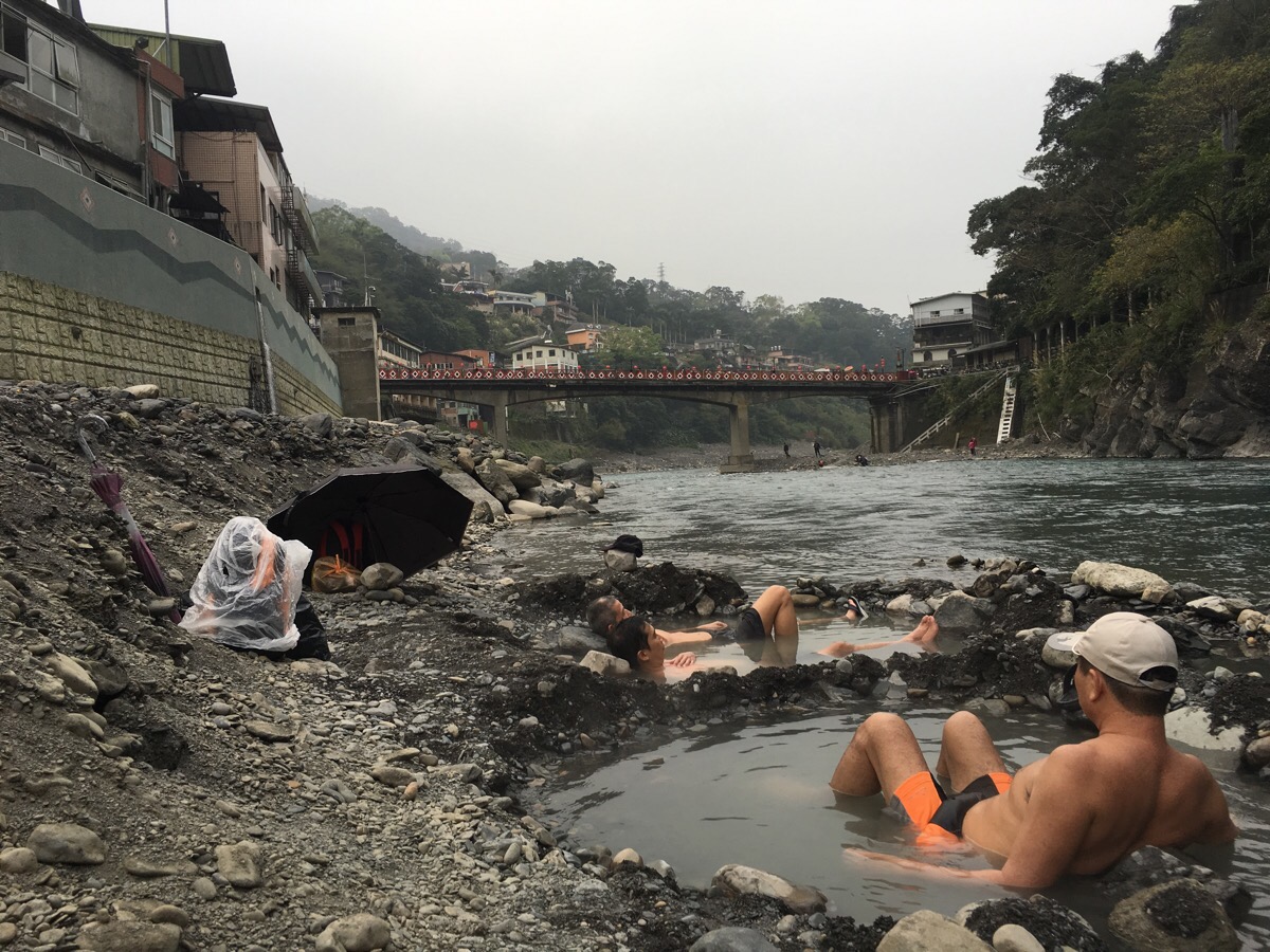 The blue of the water against the slate-grey rocks and rich green foliage is a beautiful palette of colours. After a nearly eight-hour hike, we were looking forward to getting our feet into the restorative waters of Wulai hot springs so we wandered through the old street picking up a coffee on the way to the free public access waters along the river. Technically the hot springs aren’t open for public use (as of February 2018) because the government is in the process of renovating the area, however the sign just bears a disclaimer saying that bathing is done at your own risk, and it seems like the locals couldn’t give a fig about health and safety disclaimers. The regulars have clearly got their own system and hierarchy, so we tried not to tread on any toes and instead just soothed our feet in the hot waters whilst a granny in a rather flattering swimming costume and shower-cap lounged in the pool with us.