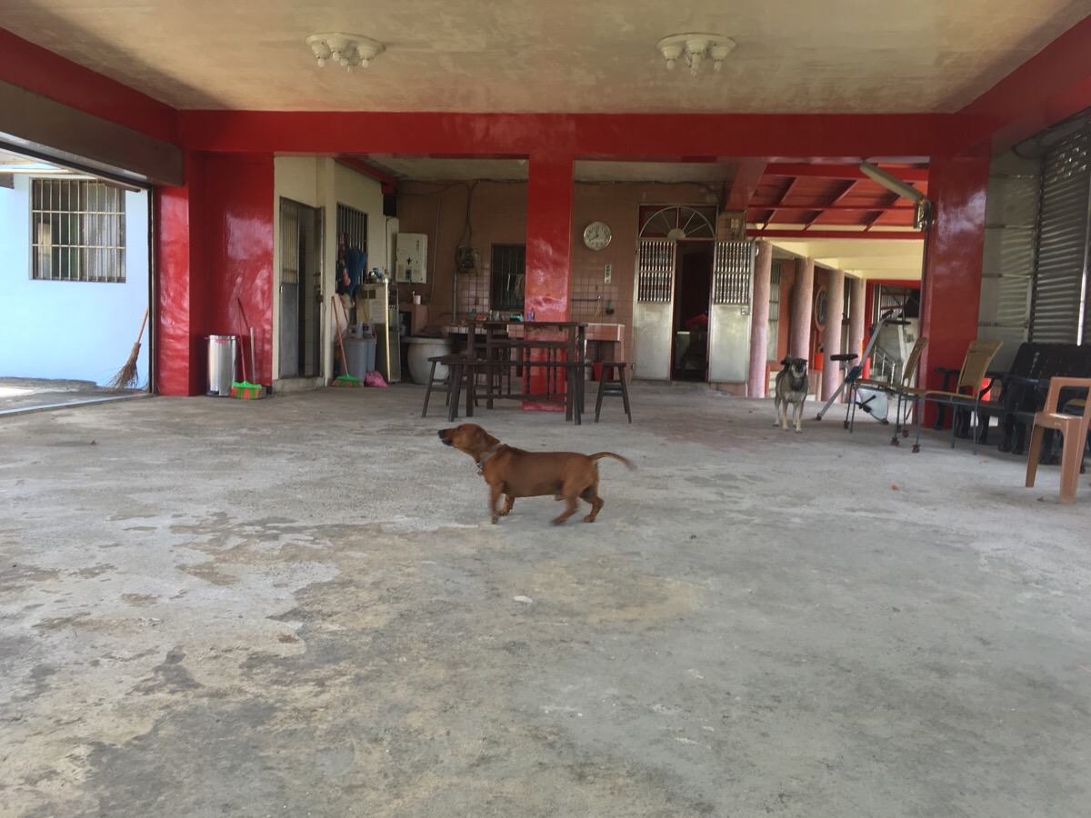 Climbing the steps on the left to the temple, we were greeted by a pair of noisy guard dogs. Although they initially ran towards us, one ran away barking, and the other sat at a distance looking scared. There are actually two small temples here, climbing the steps up from the first, you can see a second one which has been built almost around the roof of the first one.