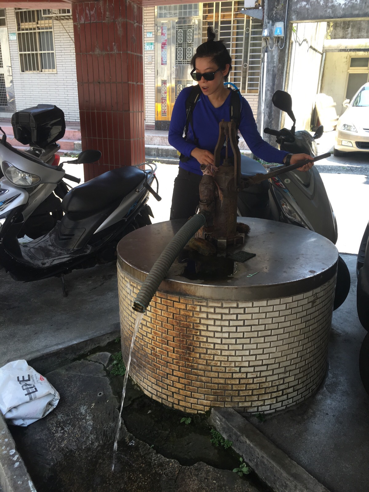 Walking along the road, we came across not just one, but two functional pumps. Teresa was rather excited to give one a go.