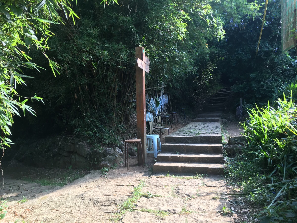There are a couple of places where there are alternative paths, but it’s easy to keep following the path up. At this junction, there is a large assortment of stools and what looks to be a dwelling. Further up again there is a closed off temple. It was noted on the map as being San Sheng Temple/三聖宮, and in blog posts I’ve found dating back to 2012 it seems to be permanently shut. However, since the plants haven’t claimed it and the courtyard appeared recently swept, I’d guess that someone must be visiting – if only to maintain it and feed the dog who was calmly sitting behind the red gates. There was a group of walkers taking a rest here and comparing shoes, so we moved on quickly, but you can get a glimpse of beyond the gates here.