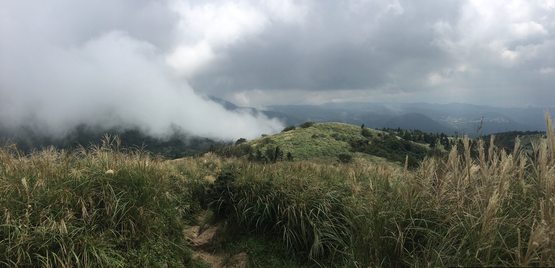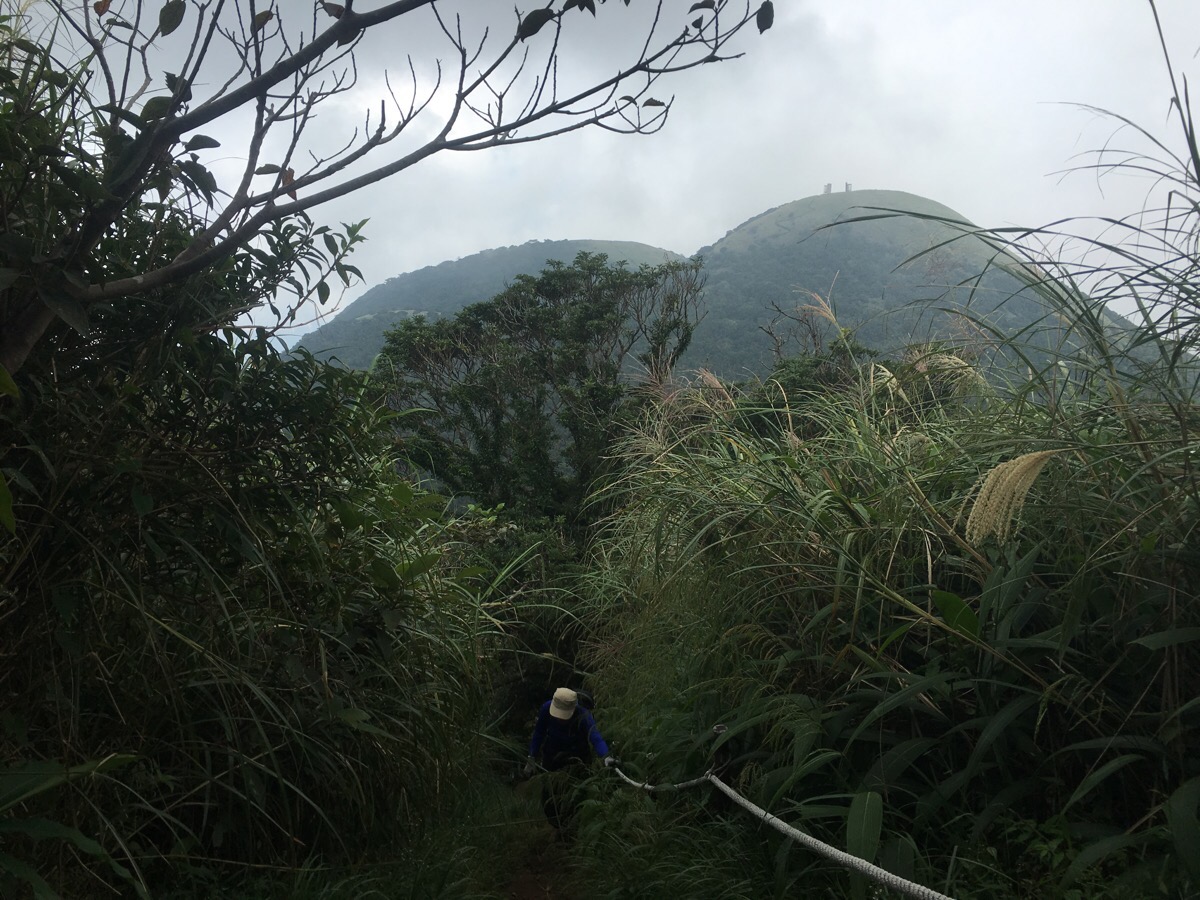 As the altitude increases, the trees gradually drop away, and the final climb to the west peak is through tall grasses. Looking back gives you views over towards the twin domes of 向天山 (left), and 面天山.