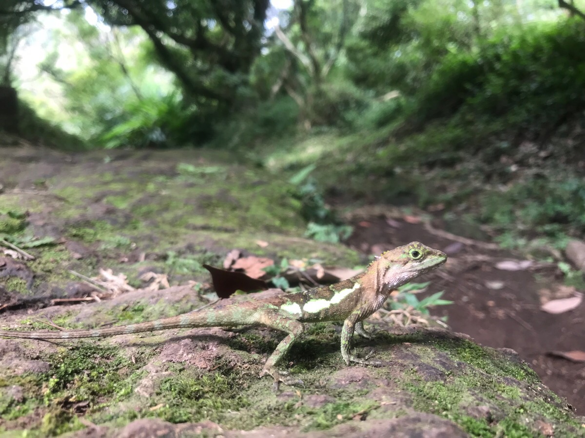 We went up to the right, but first we stopped to have lunch on the bench at the junction. As we were settling down, a man passed us and let us know that there was a snake just up the trail, a large tan-coloured thing which coiled back when it saw us. Thankfully it stayed further up the steps whilst we ate, and our only lunch guest was this extremely brazen tree lizard – it caught and noisily ate something just 15cm from where I was sitting before nonchalantly ambling off to observe us from a nearby tree.