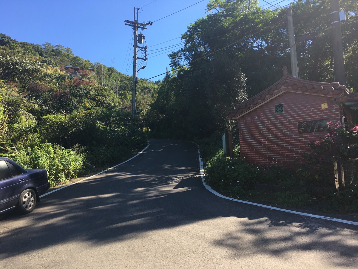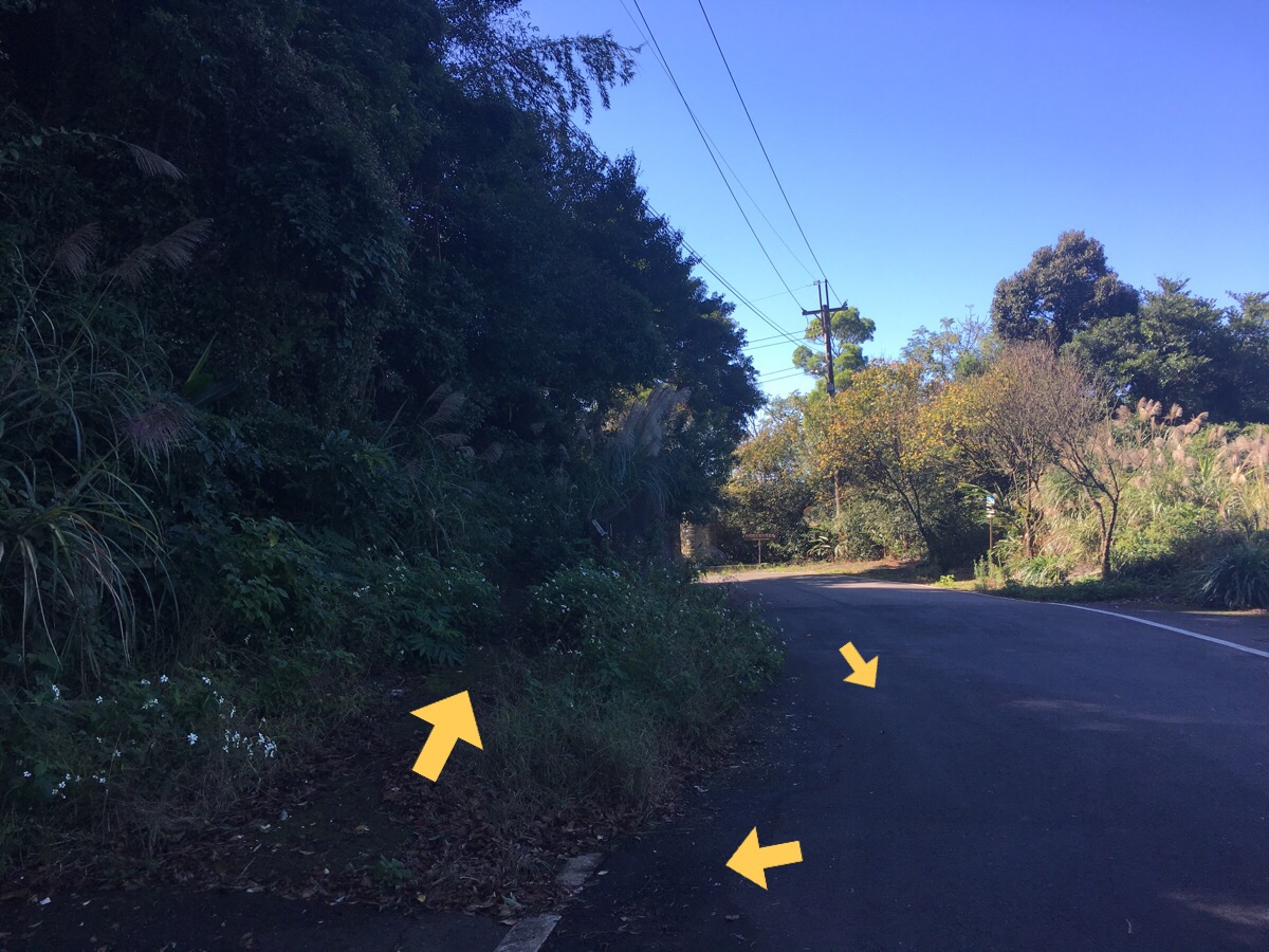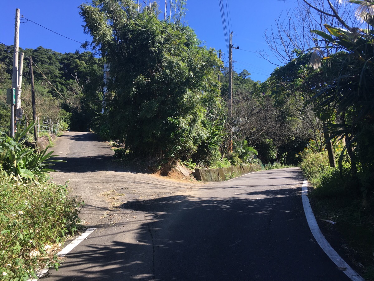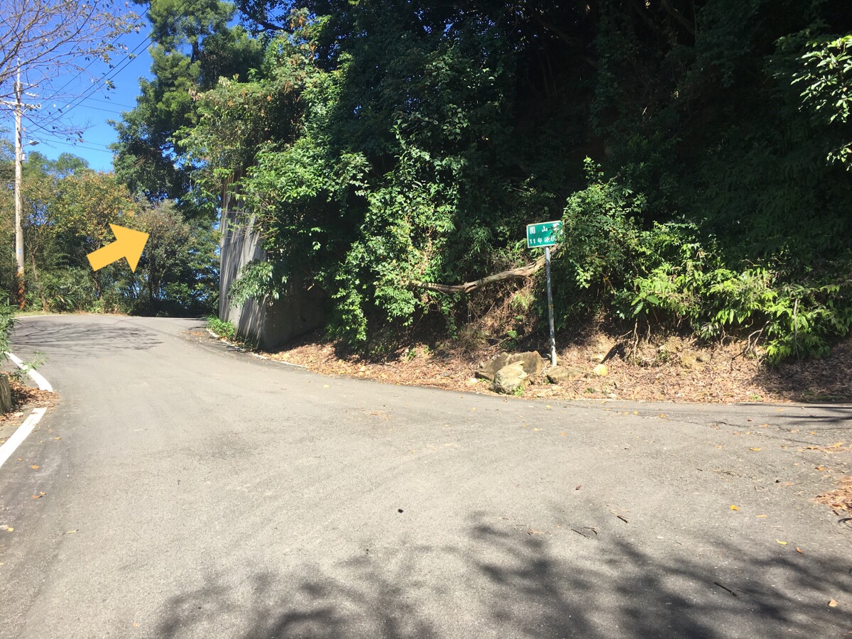 11:03 – Coming around the corner we noticed a parked scooter and some trail tags going up a ramp to our right. There’s a red and white trail sign here which says 往竿尾崙山古道 (Gan Wei Lun Shan Old Trail).