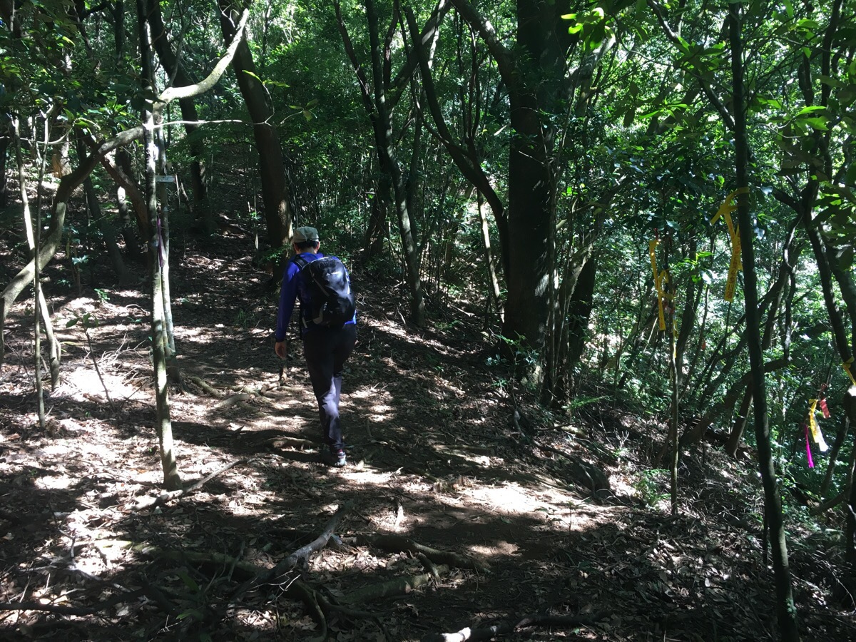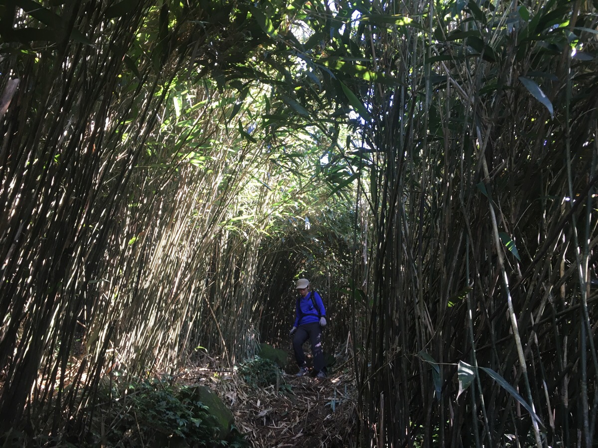 I can tell you that those 500 metres were not my favourite metres of this walk. It was about 200m from the junction to the west peak of Xiaoguanyin shan, and that was 200m of pushing through very over grown bamboo. It wasn’t really hard to follow the trail, since it was always visible at ground level, and there were regular enough hiking tags, but I would have found it harder if I hadn’t already experienced this type of trail in Taiwan before.