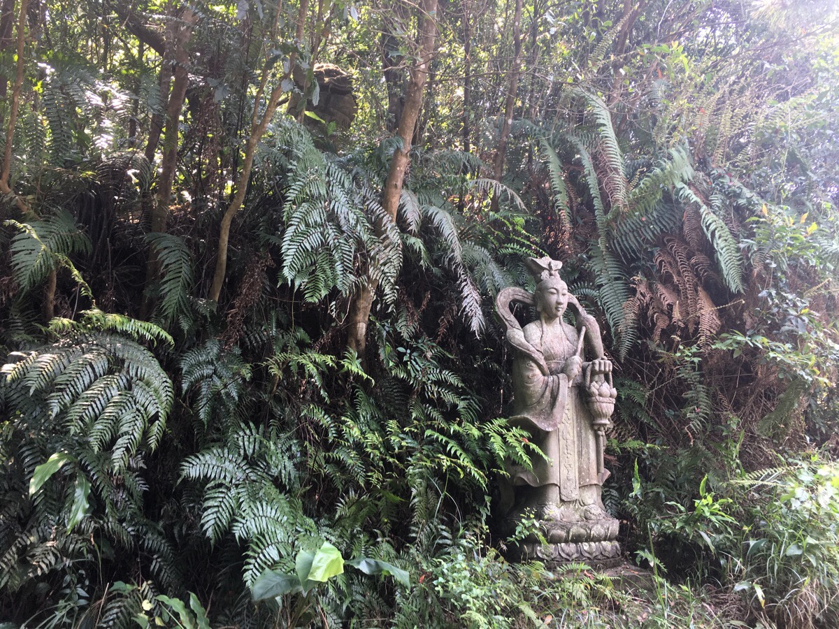 As the steps round a corner you may notice a small dwelling to the left and a tree stump which looks uncannily like a velociraptor on the right. If you turn back when you draw level with the velociraptor, you should notice a large boulder which has been inscribed with: 諸惡莫作。深信因果. Roughly translated, it means something “don’t do evil, know that karma exists.”