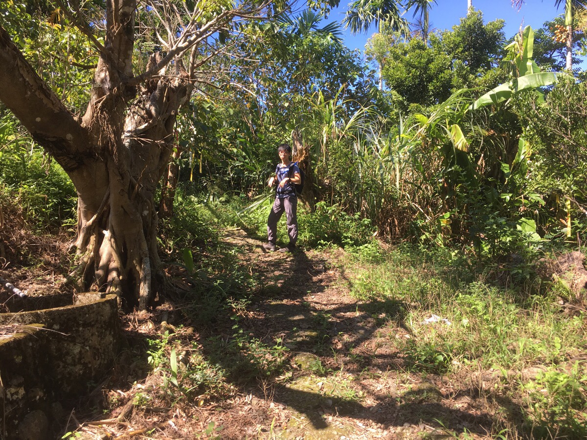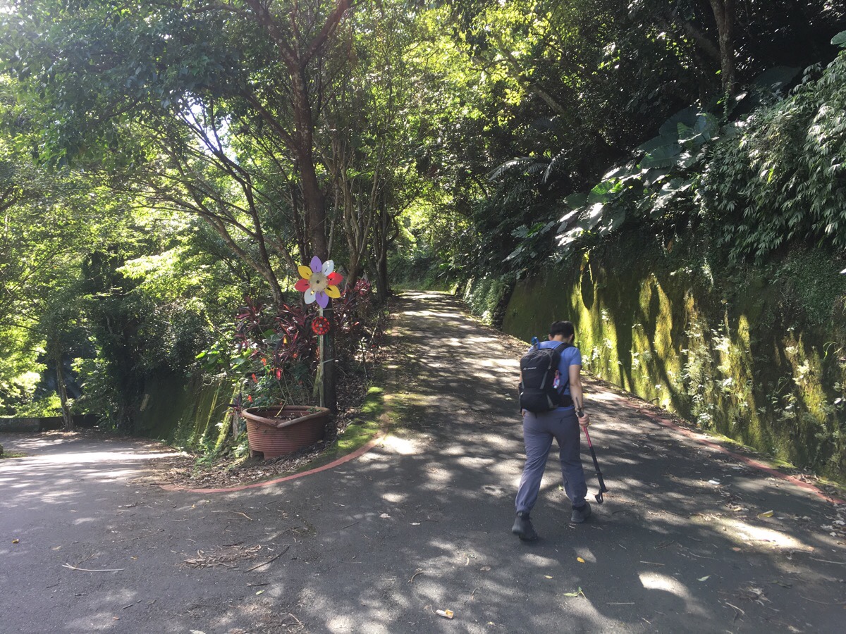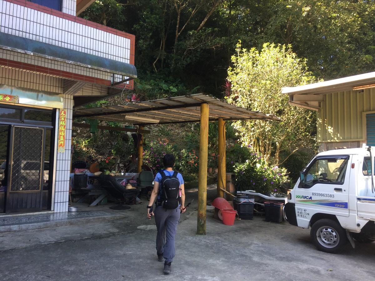 The road terminates at a collection of houses with a duck pond and farmland, (over the wall). There was another group of four or five hikers with their packs off, maybe getting ready to head up too. Teresa being Teresa, she stopped to commune with the animals for long enough to entice the landowner out of his home. He said that originally he had five geese like the one we could see, (台灣土鵝), but that the others had all died. The remaining one was over 20 years old he said. I didn’t realise that geese could live so long.