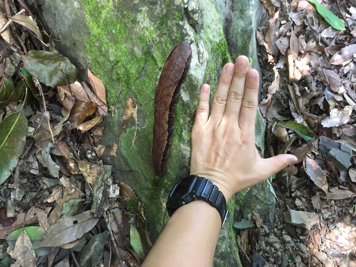 The trail for the next portion of the walk was still somewhat planned-seeming. Stones formed the trail surface, and it zigzagged incrementally up through bamboo and other varied greenery. Just as the trail went to bend to the right, I spotted what I am certain is the biggest, fattest slug that I have ever seen. Judging by Teresa’s hand, it was nearly 18cm long and extremely girthy. It was a monster slug, at least as plump as the quorn sausages you could buy back home several years ago. I later found out that it is a 山蛞蝓, or ‘mountain slug’, and is found in Japan as well as Taiwan. Despite having been vegetarian for well over three quarters of my life, (and not finding insects at all appealing), I couldn’t help but imagine what a great meal that slug would have made if I were a bird, snake or other slug-eating creature.