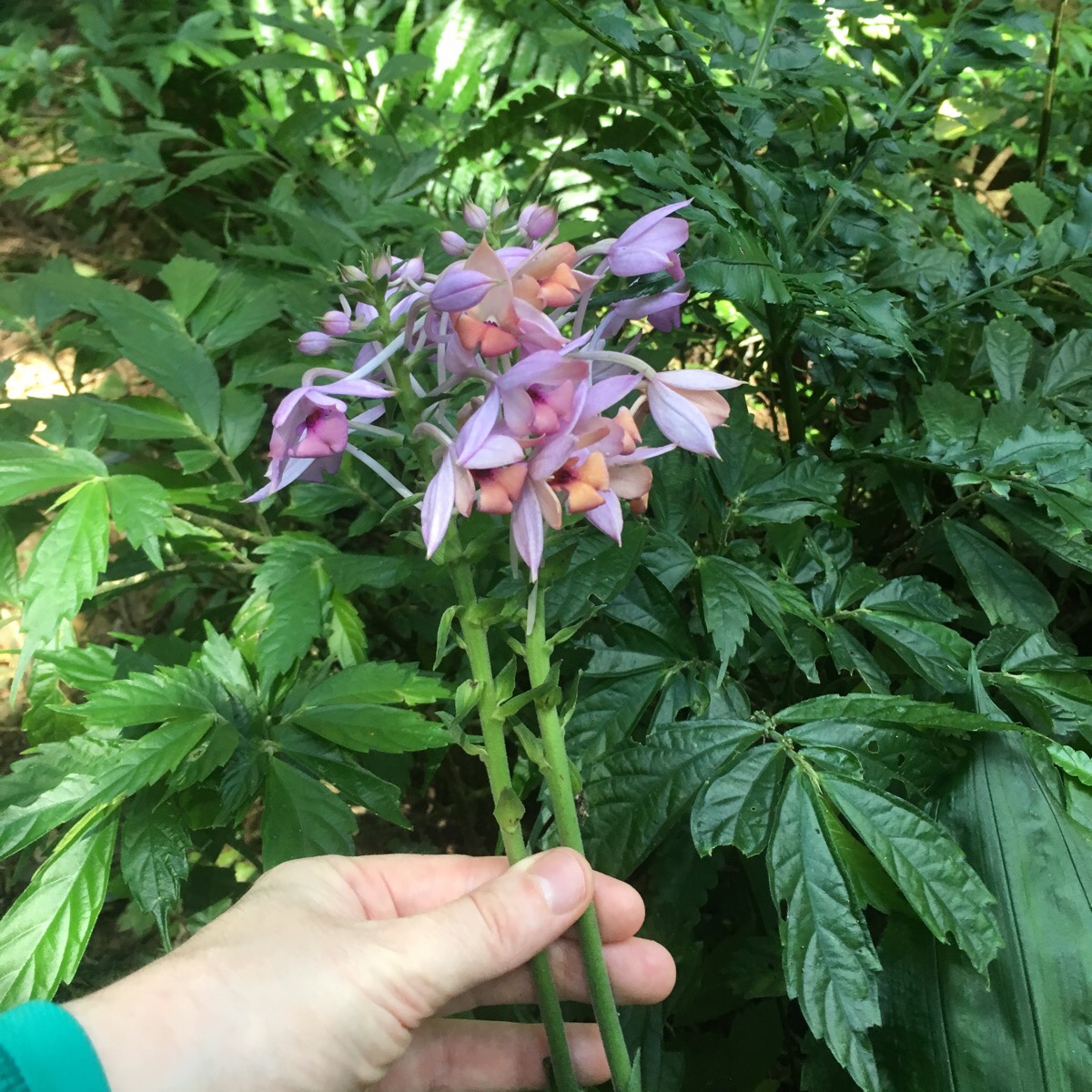 Along the way I spotted a couple of these elegantly shaded orchids. Another visitor to the area called them 長距根節蘭.