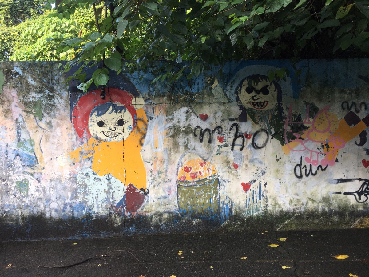 Along the way someone has modified some cute playground graffiti into something hellish – the original simplistic features have been turned into evil, toothy grimaces. Honestly, I quite like it. By now, I’ve become somewhat inured to the Taiwanese love of horrifically cute characters, but I remember when I first arrived I thought they were a little creepy, so it’s good to see someone making the most of that potential. (And note the pink poop-snail to the right. I’ve seen him in a few places around here.)