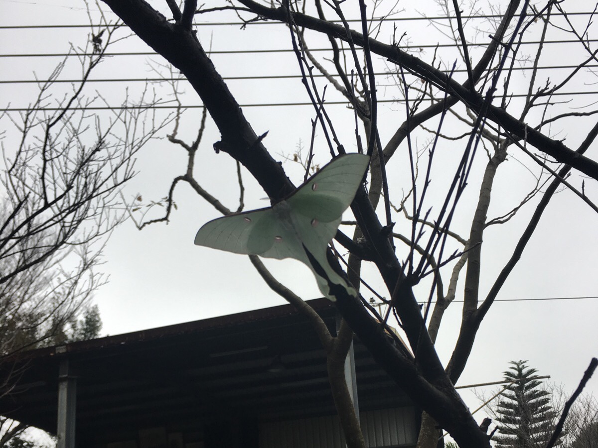 Upon getting back to where the car was parked, Teresa went off to collect Sausage from another dog that she was bothering and I caught sight of this beautiful pale-green thing fluttering on a branch. It turned out to be a species of luna moth, (probably Actias neidhoeferi since that seems to be the one that’s found in Taiwan). It was somewhat uncooperatively sitting with its wings out against the brightest part of the sky, so the photo doesn’t really do justice to the beautifully creamy-coloured intensity of its wings, but even so, I was lucky to see it.