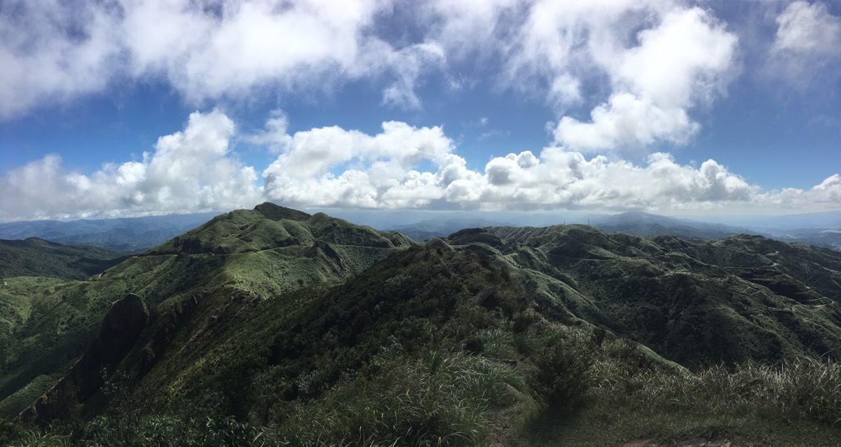 The trail reaches the first of several peaks along the ridge. Myself and the guy who had just started out on the path in front of me stopped to rest and enjoy the view. Looking back where we’d come, the foreground was dominated by the big slab of rock that jutted up like a screen partition, and behind that was the summit of Canguangliao Shan/燦光寮山. A red sign warns hikers of the dangers involved in continuing, but the trail was clear and well trodden. (The sign is a warning rather than an indication of a prohibition.)