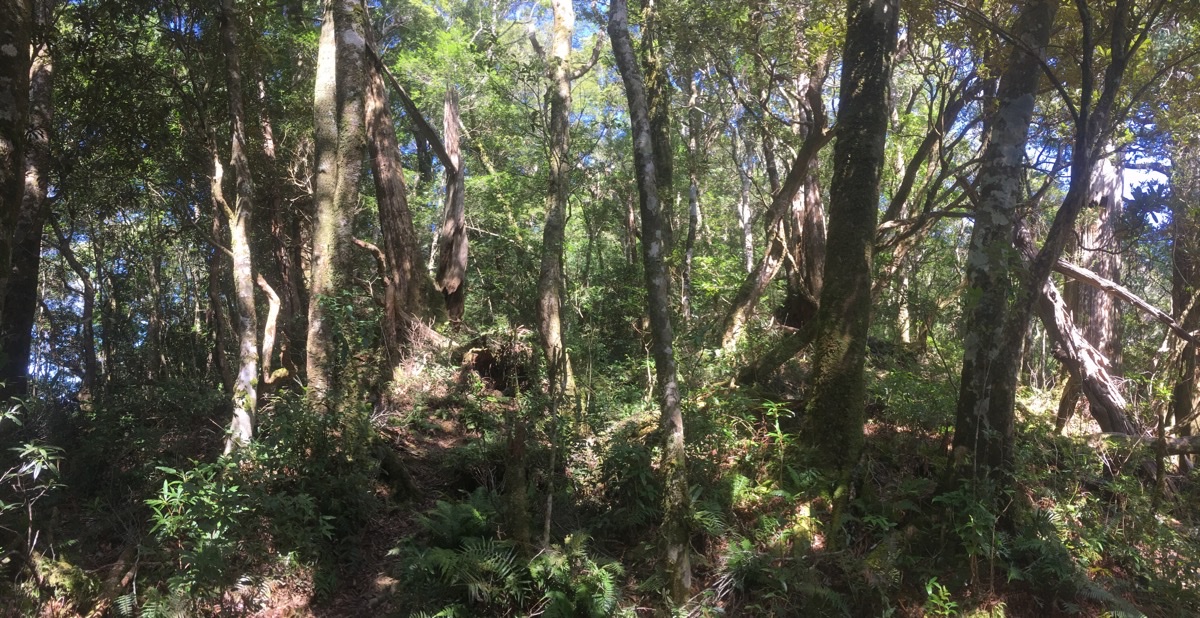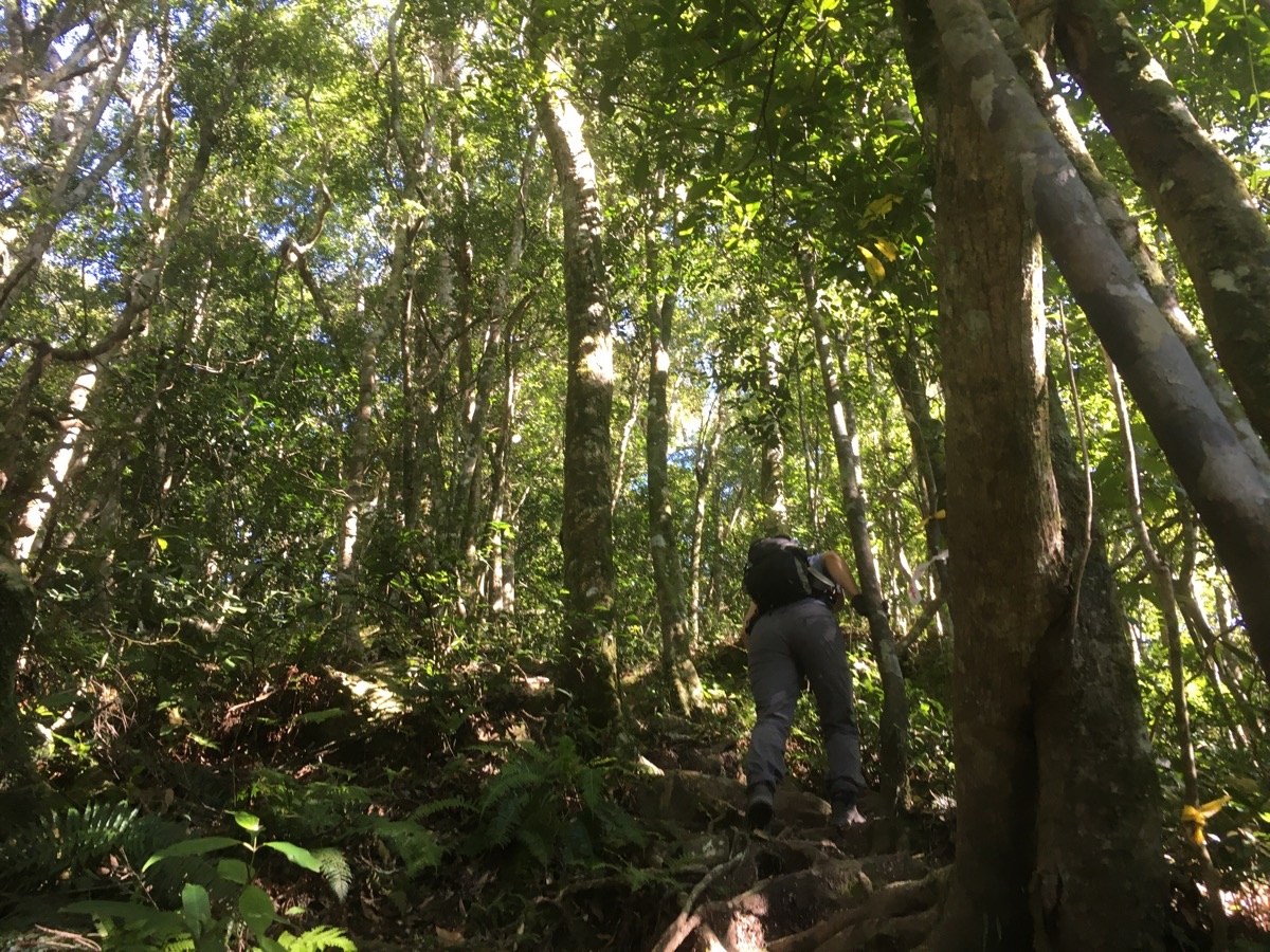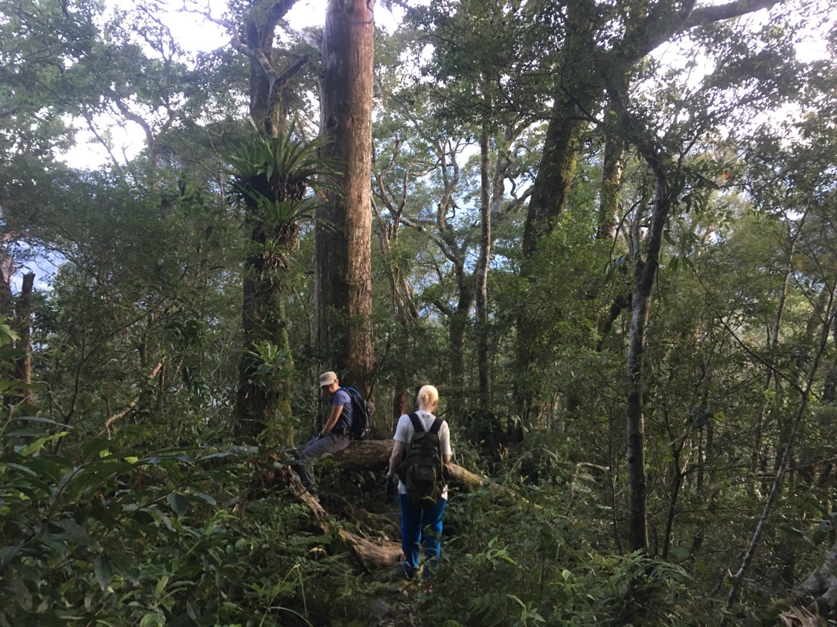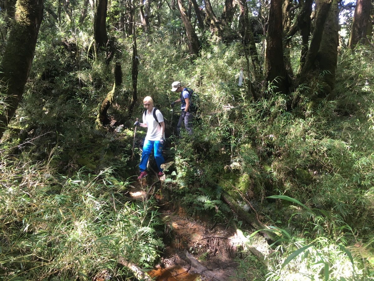 At first it was pretty much as expected, the path snaked forward though beautiful old forest, and we were making good progress. But then the first of several challenges presented itself: mud. The combination of broad, flat ridge and cloud-catching foliage had resulted in the path becoming a series of squelchy puddles. Progress slowed as we were forced to step carefully through and around the mud. More enjoyably, there were also many huge trees to appreciate and the old forest was majestically pretty.