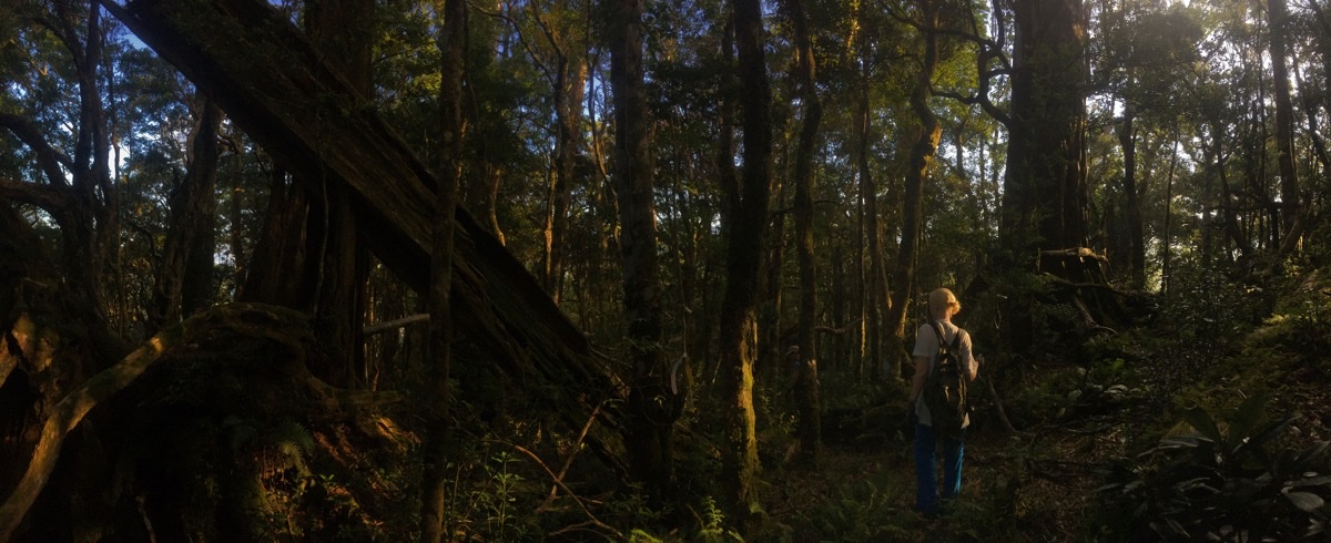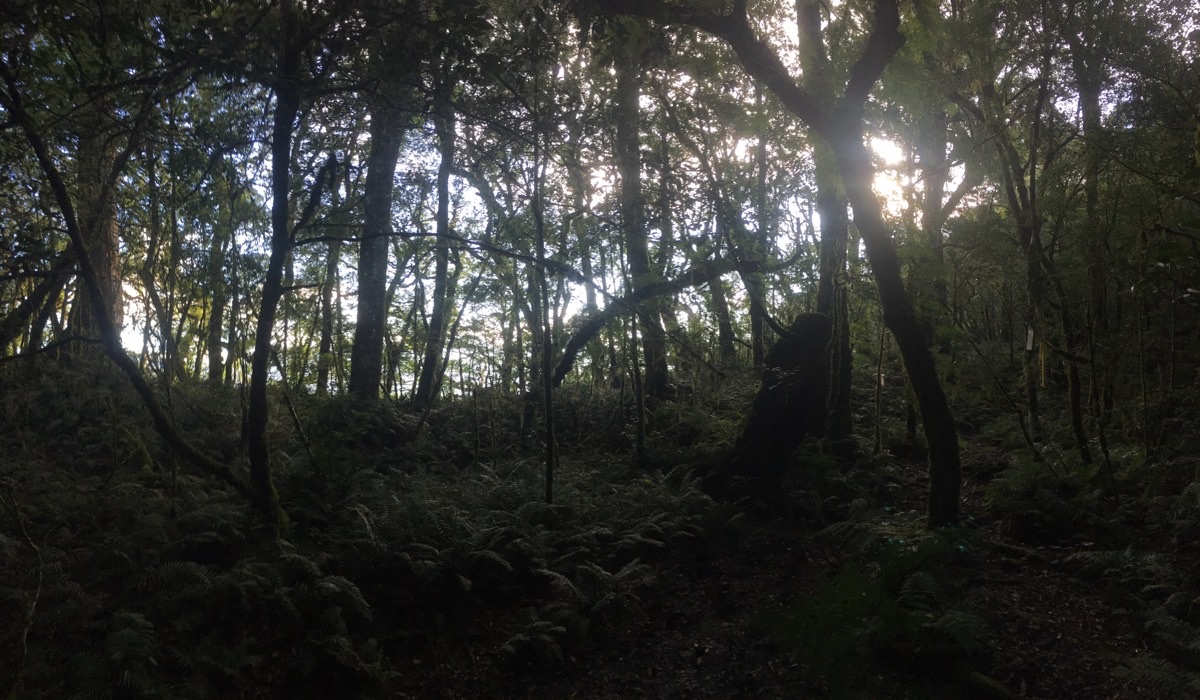 As we descended the spine of the ridge back down to the road we walked into the magic hour. Both K and I have a passing interest in photography and so we were enthralled by the golden light. It’s the perfect accent to bring to life all those greens and browns, and when combined with the varied textures of mosses, ferns and bark it becomes like a feast for your eyes.