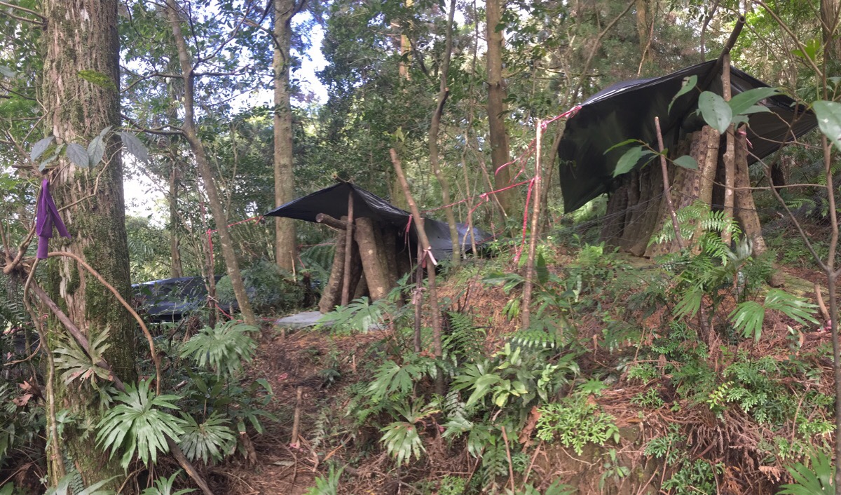 It was not far up from this farm that we came across the first of two mysteries on the trail. Dotted around in the forest we found many of these structures – plastic sheeting or sometimes tarp tented over logs that had been leant at an angle against a central pole. At first glance, I thought the wood was that kind of fern-y tree which has a spot pattern on it, but a closer look suggested that wasn’t the case. Later on, after getting home I posted a couple of pictures on Twitter, and within 12 hours the mystery had been satisfyingly solved by several smart people.