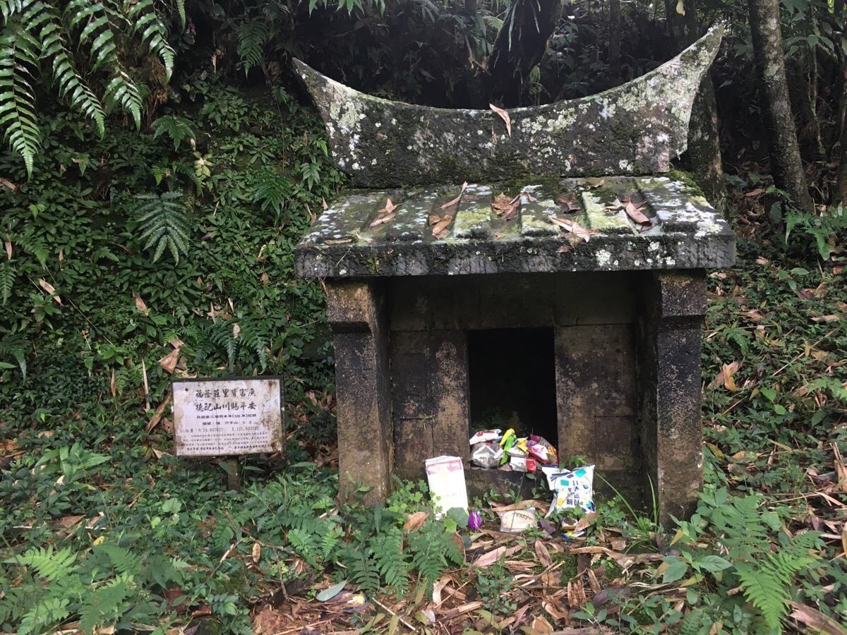 To the left of the path there is a small land god shrine, the third of three that we saw on this trail, (the first being right by the entrance and the second being a very easily missed four-stone structure between two trees). This one has been rebuilt in recent years, but it was first established in 1904. The locals who used these historic trails long before they became historic needed to make sure they were protected on their journeys, and so it’s very common to find multiple small shrines on such paths. The resident god was a small figurine, just 10cm tall, but he had been well-fed by people passing through.