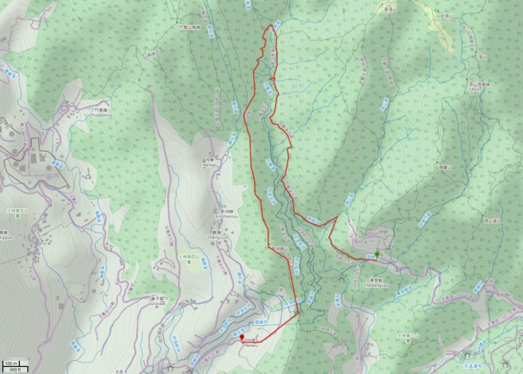 From there, the trail cuts down a little to the first of two stream crossings. Cross over the water/rocks here and look for the hiking tags climbing up on the far side. There is another trail on the left here which definitely heads to Gaoding Shan bad North Wuzhi Shan (北五指山).