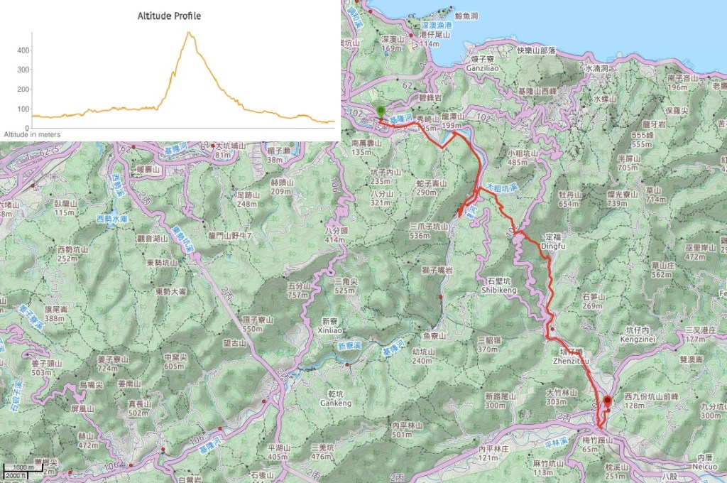 TOTAL ASCENT: 500-600 metres, (tracking problems again), almost all of this climb and the subsequent descent was done on the Jinzibei Trail.