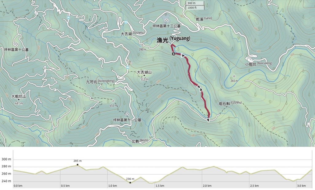 The walk starts at a meander so looped that it could almost mistaken for an oxbow lake if not for the lazily flowing water. The watercourse here is Beishi River (or Beishi Stream I suppose), the very same Beishi River which cuts through the town of Pinglin and which accompanies some of the prettiest parts of the Tamsui-Kavalan Trails. The loose gathering of houses here belongs to the village of Yuguang (漁光), a small settlement with little more than a campsite, police station and a land god temple. It seems that a tributary which joins at the apex of the meander is known as a summer hangout spot for locals because there were a few families splashing around in the shallow waters and making use of the shade from a narrow road bridge.