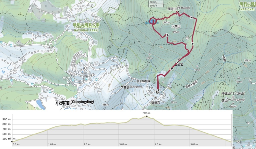 (Actually there is another trail leading away from Miantian Shan, it looks like it’s marked on my map as being 艱難路線, but I can’t find any references to a trail of that name in Yangmingshan National Park so it’s either never walked, or is walked but has a different name. Either way it’s very easy to miss so you don’t need to worry about accidentally taking the wrong route down.)