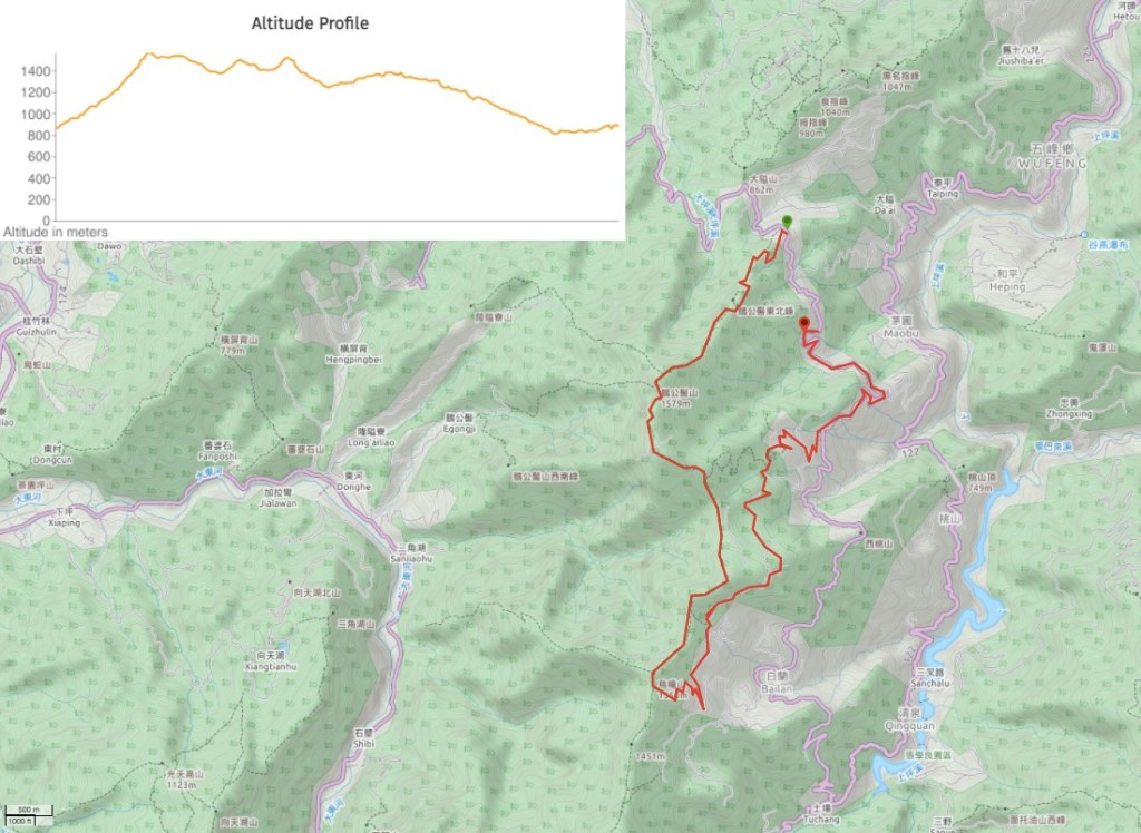 - Junction where the track leading down from Shang Shan Ren Jia meets Maopu Forest Road – N24 36.325 E121 05.665 (if you’re hoping to do A-B car parking, then somewhere near here would be your best bet – unless you don’t mind driving up narrow forest tracks).