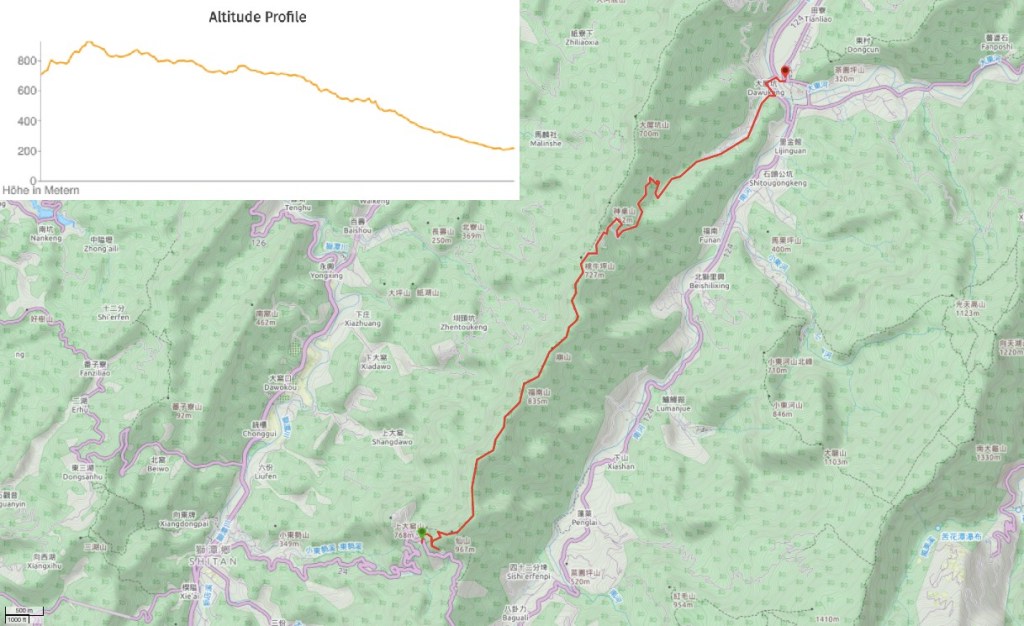 TOTAL ASCENT: A little over 600 metres to a high point of 967m on top of Xian Shan. We actually descended quite a bit further (1000+m) than we climbed.