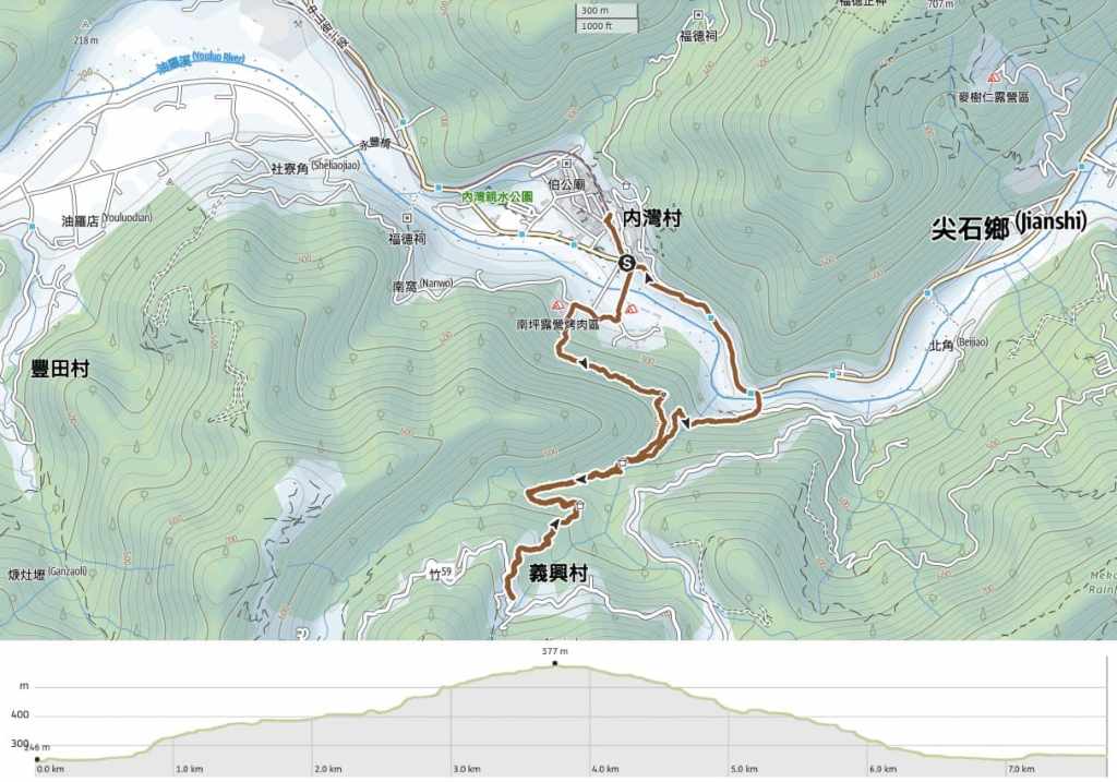 The 7-Eleven sits on a junction beside Youluo River (油羅溪), and from its windows, you can see Neiwan Suspension Bridge. This is where the walk starts.